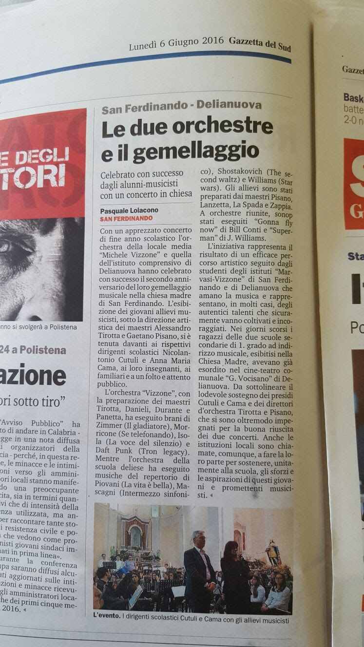 SAN FERDINANDO - Giorno 3 Giugno 2016 con un apprezzato concerto di fine anno scolastico l'orchestra della Scuola secondaria di primo grado "M. Vizzone" e quella dell'Istituto comprensivo di Delianuova hanno celebrato con successo il secondo anniversario del loro gemellaggio musicale nella chiesa madre di San Ferdinando. L'esibizione dei giovani allievi musicisti, sotto la direzione artistica dei maestri Alessandro Tirotta e Gaetano Pisano, si è tenuta davanti ai rispettivi dirigenti scolastici Nicolantonio Cutuli e Anna Maria Cama, ai loro insegnanti, ai familiari e a un folto e attento pubblico.