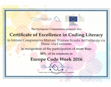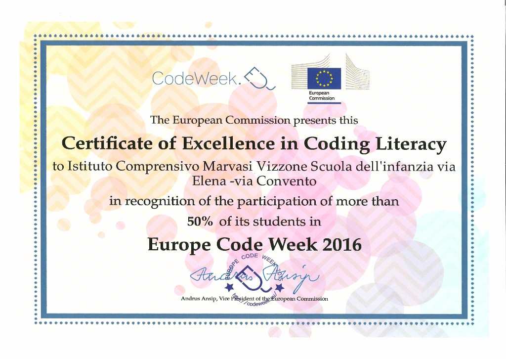 Il Certificato di Eccellenza in Coding Literacy, frutto della determinazione e della grande partecipazione nei confronti della EuCodeWeek4AllChallenge è finalmente arrivato. Un certificato a firma della Commissione Europea nel nome del vice presidente Andrus Ansip, che da merito alle scuole che si sono distinte nella diffusione del Coding.