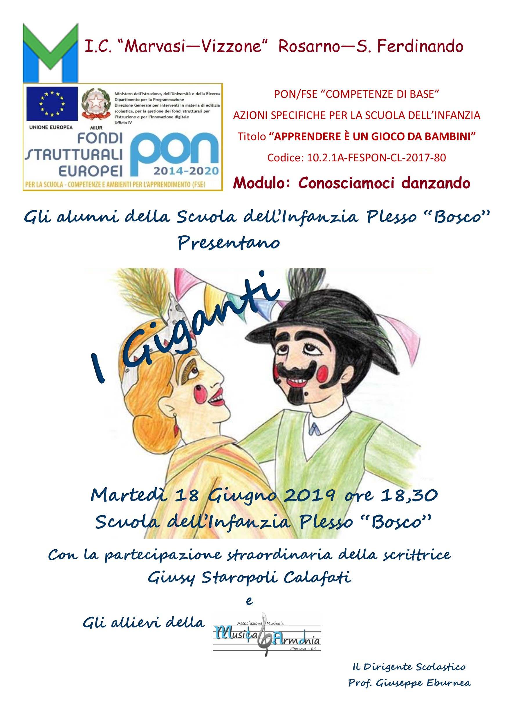 I bambini della Scuola dell'Infanzia del Plesso "Bosco", nell'ambito del Progetto PON "Apprendere è un gioco da bambini" Modulo: Conosciamoci Danzando, Docente Esperto Penna Anna Maria e Docente Tutor Carbone Concetta si esibiranno nella rappresentazione del ballo d'amore dei leggendari personaggi dei Giganti. Alla manifestazione prenderà parte la Scrittrice calabrese Giusy Starapoli Calafati. Gli inteventi musicali a cura degli allievi dellAssociazione musicale "MUsica & Armonia".