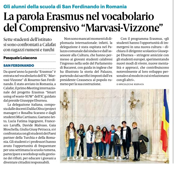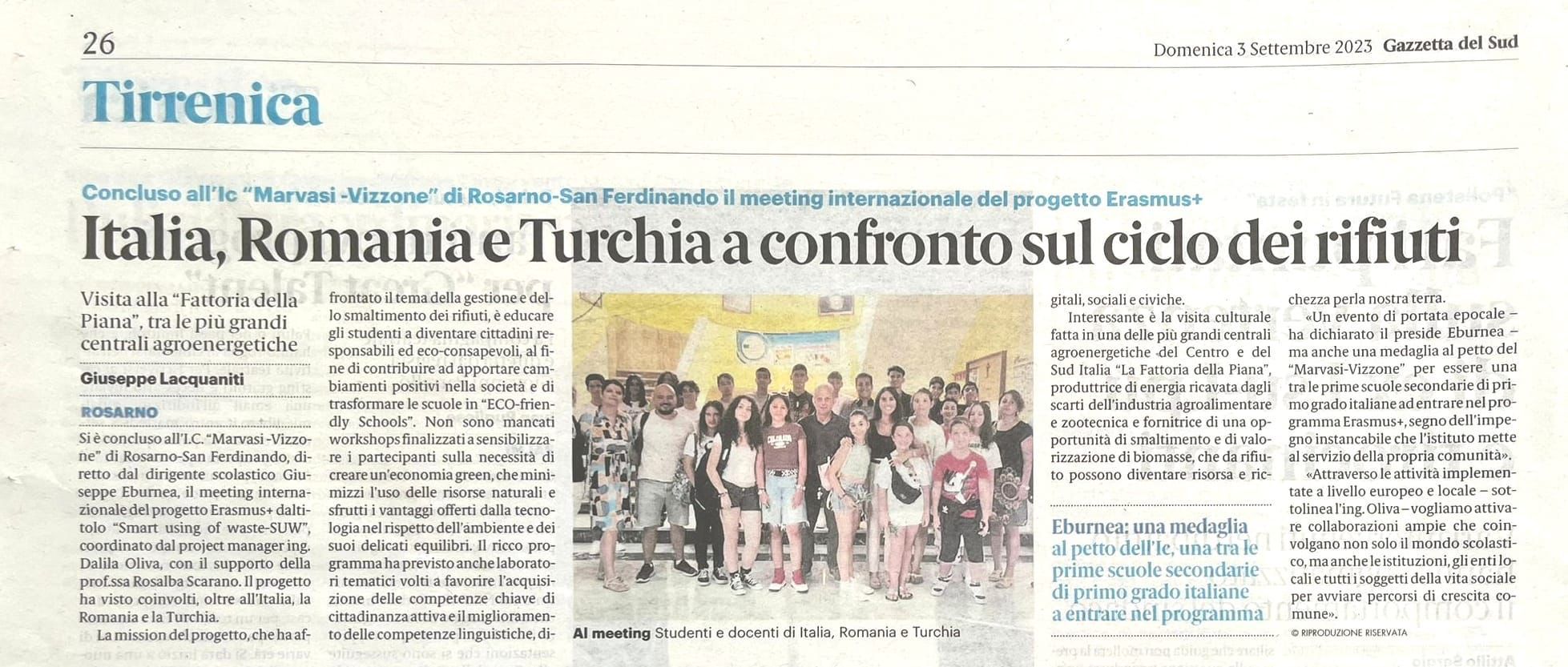 Il progetto Erasmus+ “Smart using of waste-SUW”, coordinato dal Dirigente Scolastico Dott. Giuseppe Eburnea e dal Project Manager Ing. Dalila Oliva, affronta il tema della gestione e dello smaltimento dei rifiuti. Il progetto ha previsto tre incontri internazionali nei Paesi delle scuole coinvolte: Italia, Romania e Turchia.