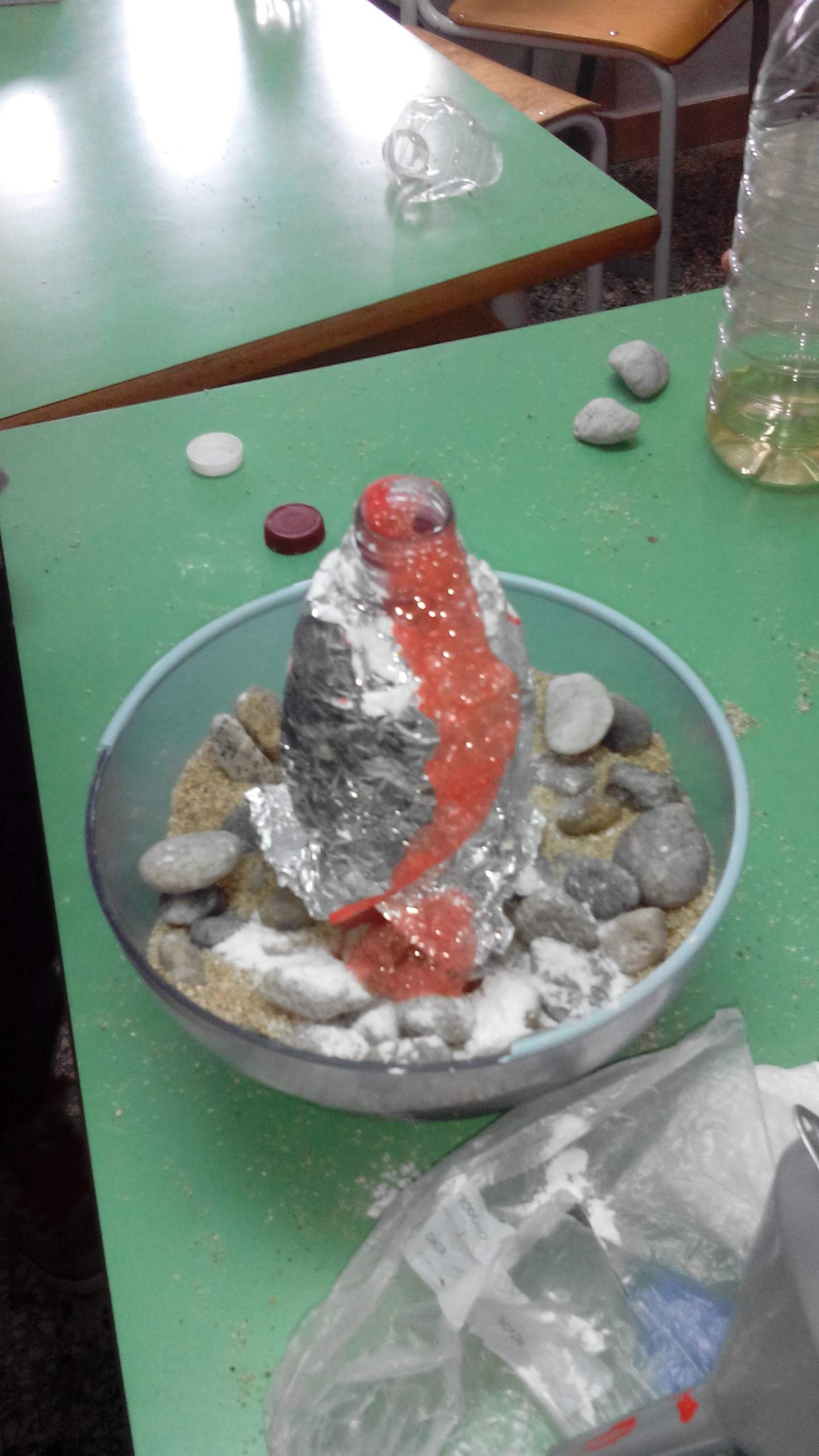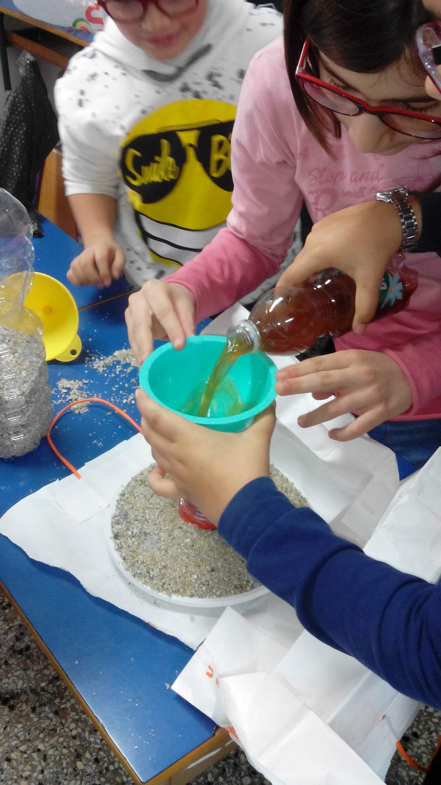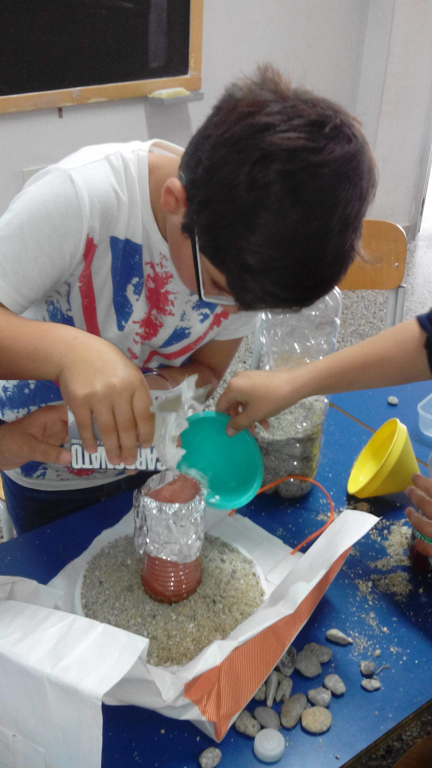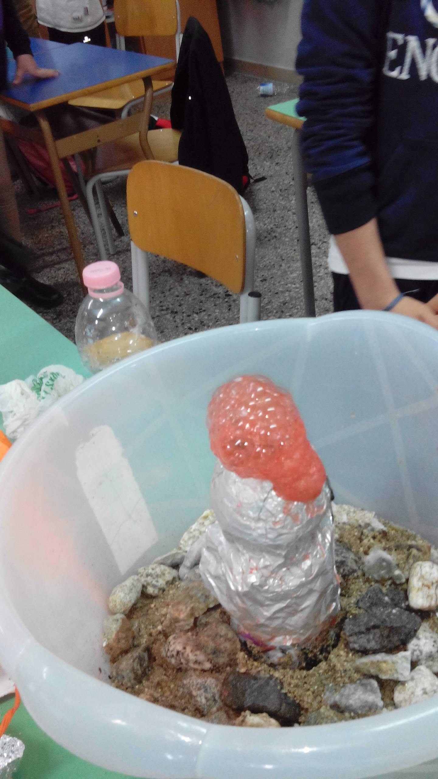Incuriositi da queste montagne particolari, abbiamo riprodotto dei piccoli vulcani e, utilizzando semplicemente bicarbonato, aceto e colorante, gli alunni della classe IV A hanno simulato la fuoriuscita della lava dal cratere e larelativa colata lungo i fianchi del vulcano.