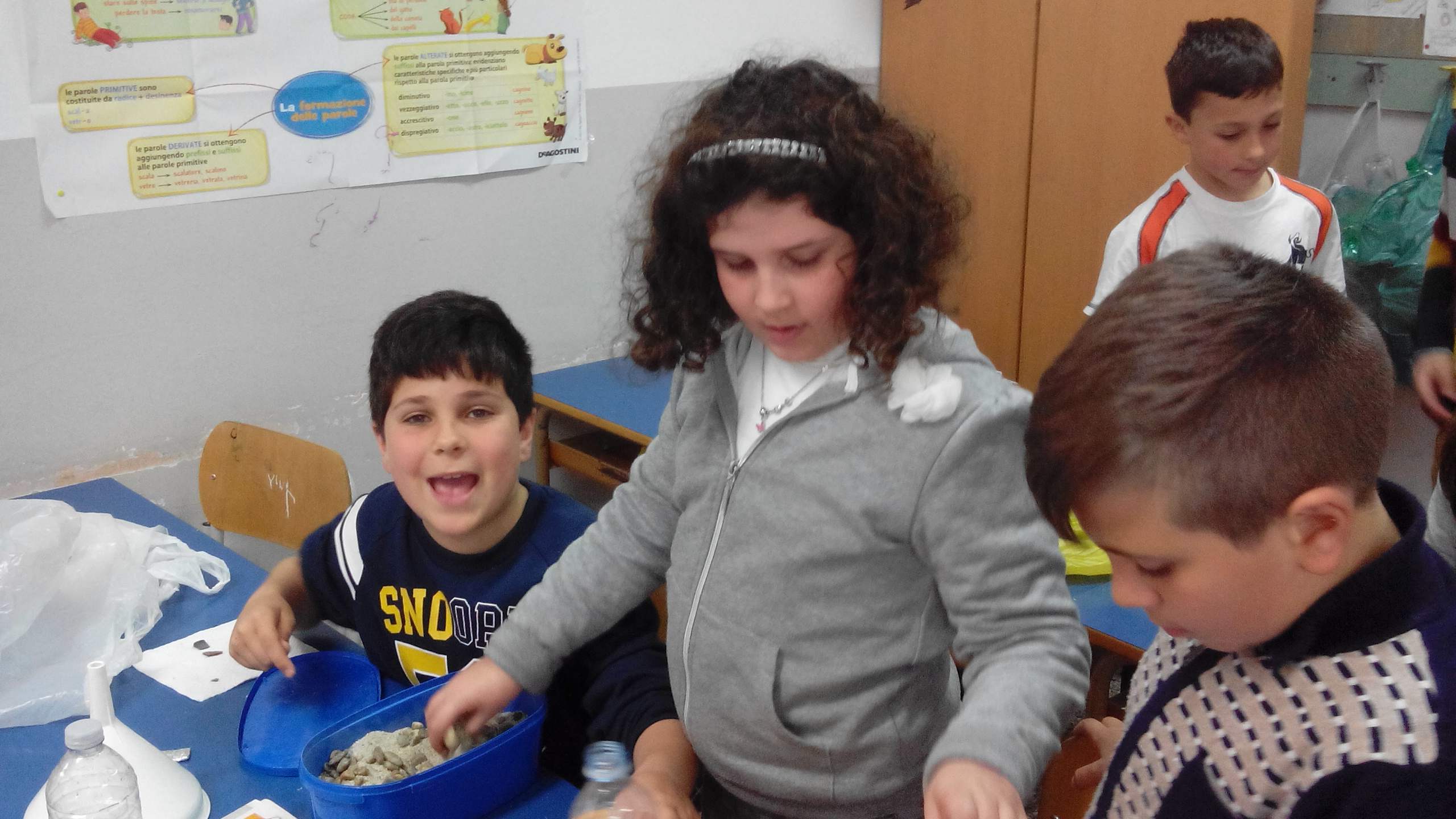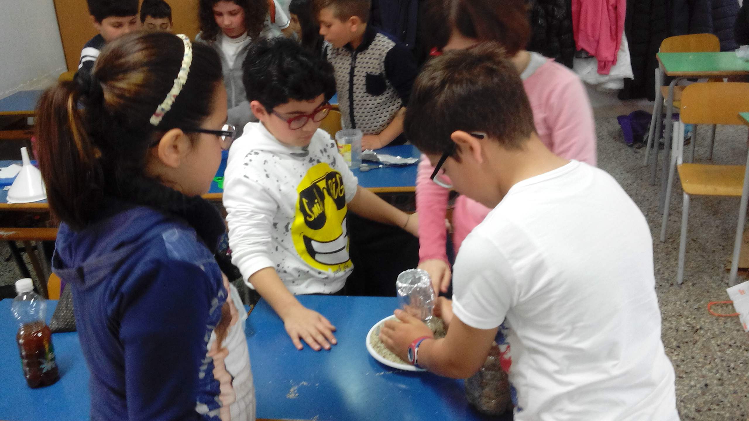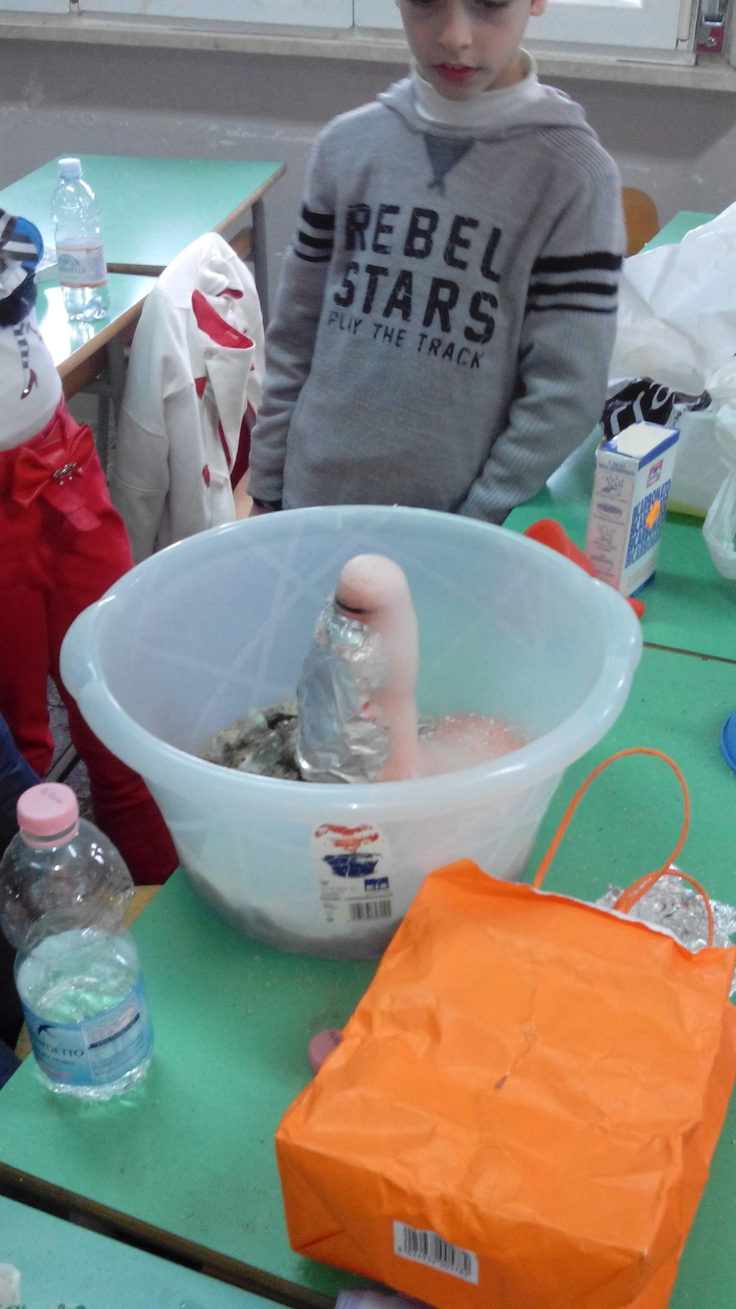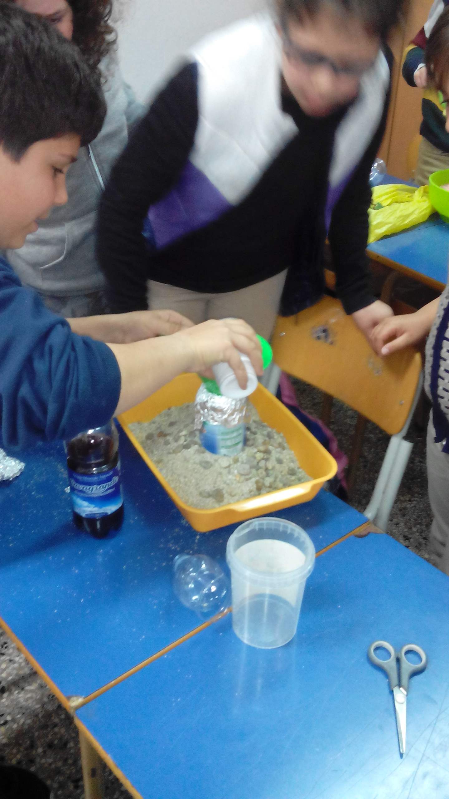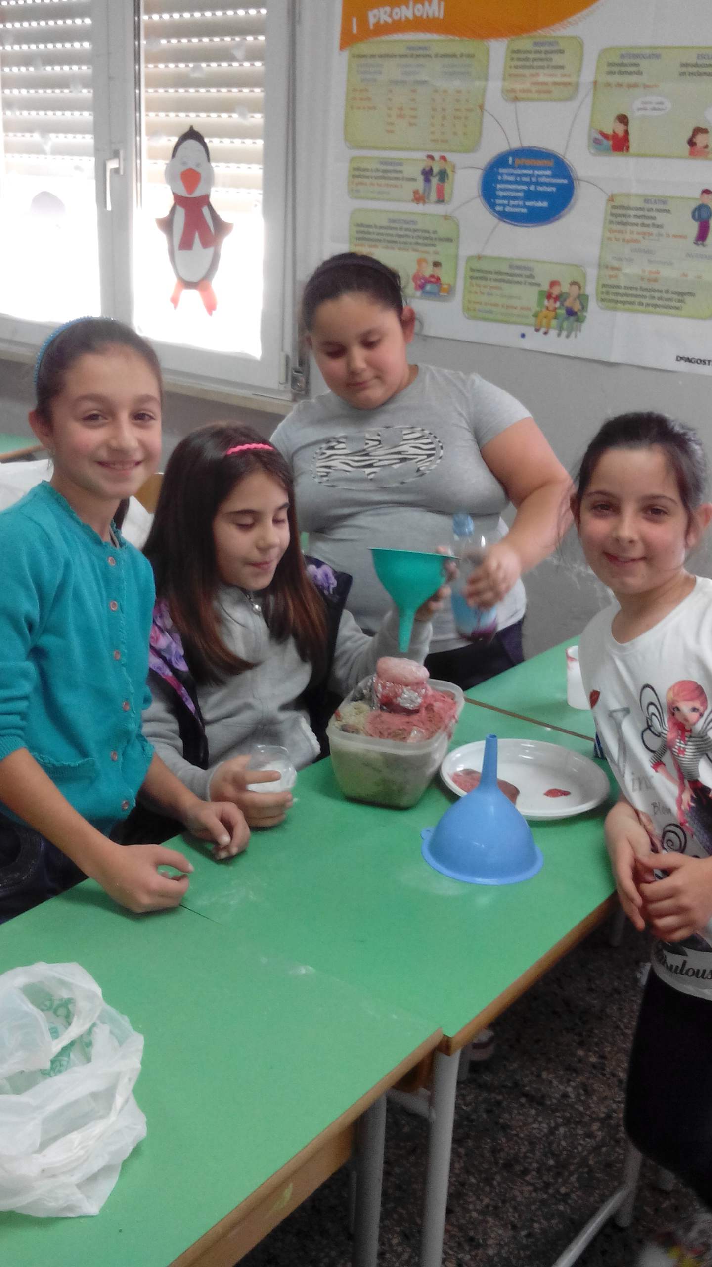 Incuriositi da queste montagne particolari, abbiamo riprodotto dei piccoli vulcani e, utilizzando semplicemente bicarbonato, aceto e colorante, gli alunni della classe IV A hanno simulato la fuoriuscita della lava dal cratere e larelativa colata lungo i fianchi del vulcano.