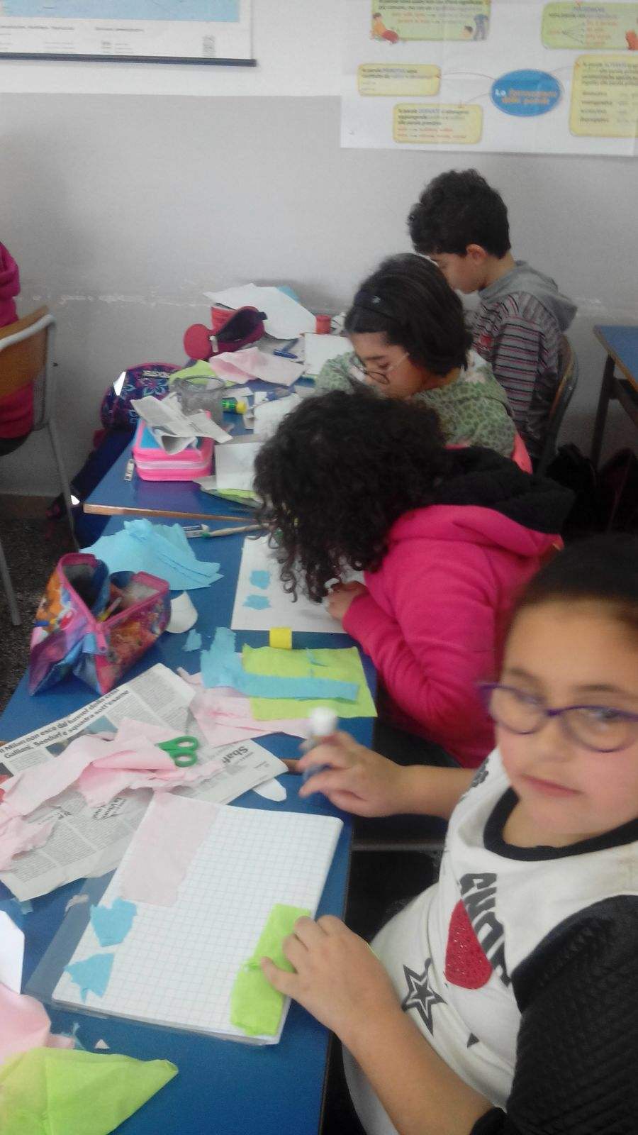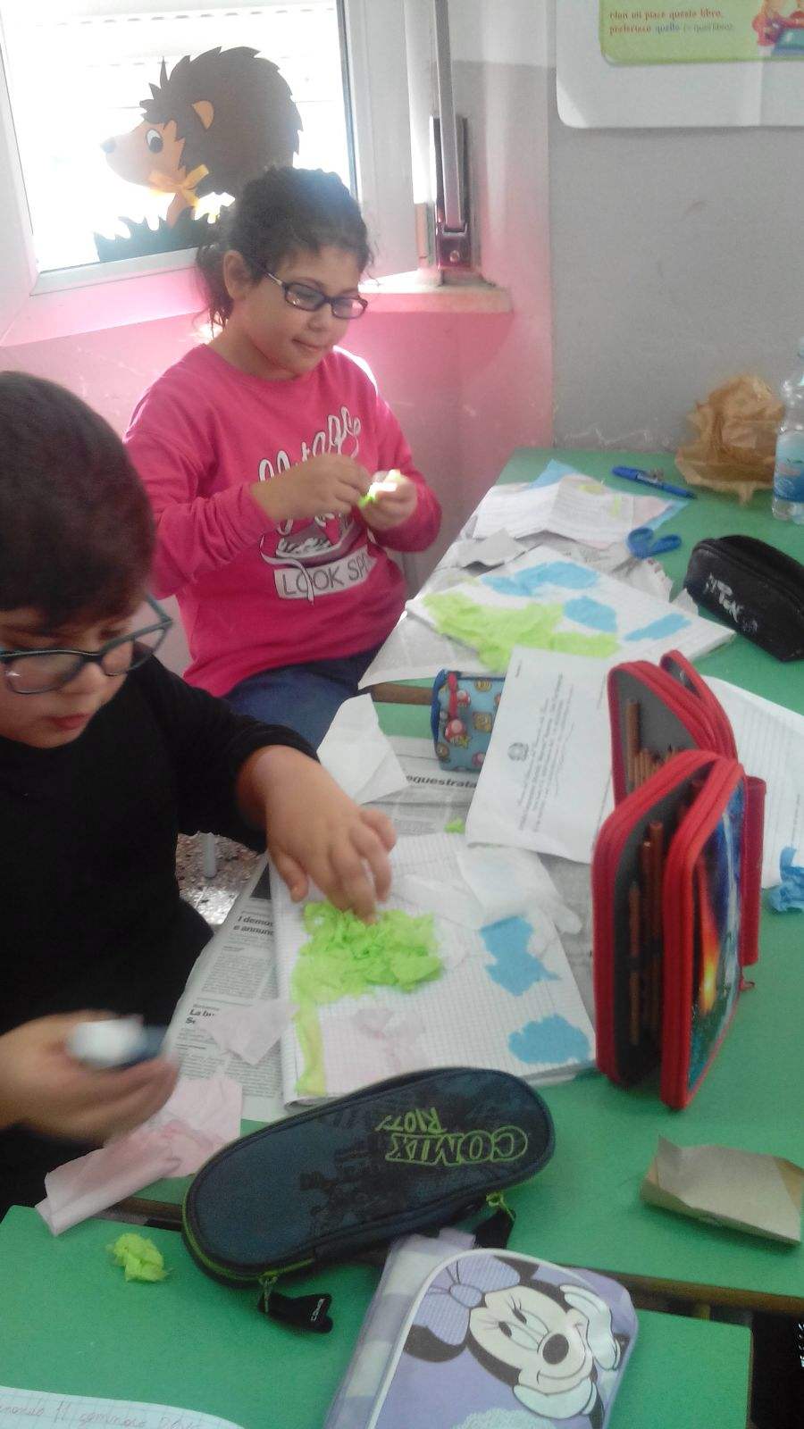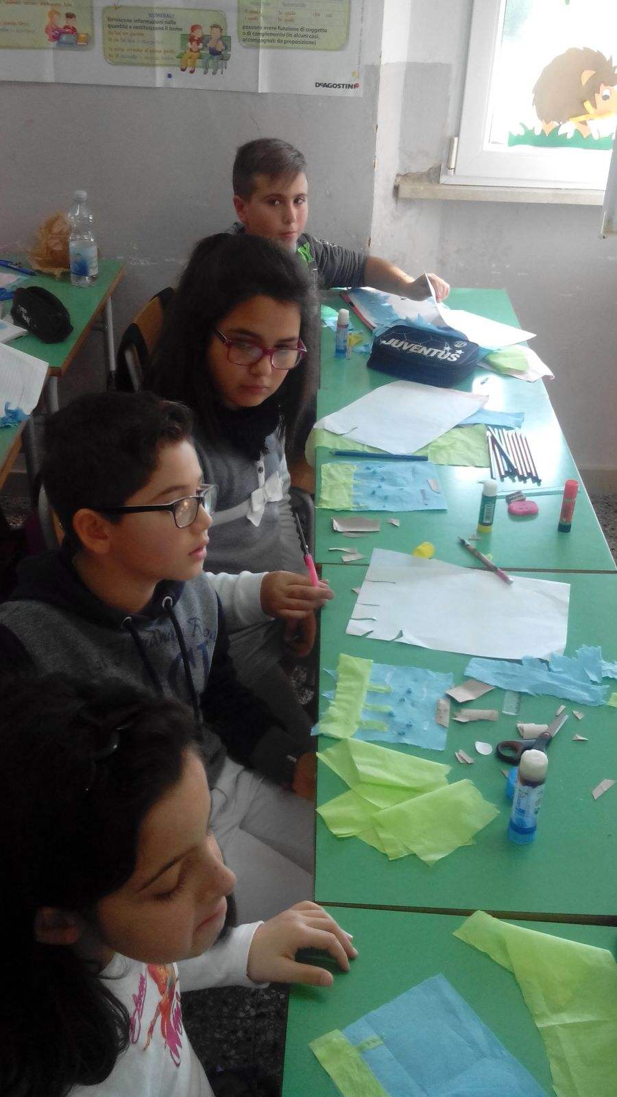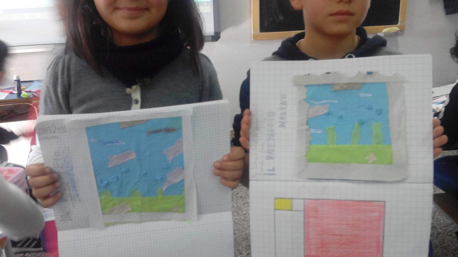 Gli alunni della 4^A, del Plesso "G.Carretta", nel laboratorio di arte e immagine, realizzano superfici a strappo per "movimentare" le linee precise del pittore Mondrian, utilizzando materiale di rIciclo: giornali, tovaglioli e cartoncini.