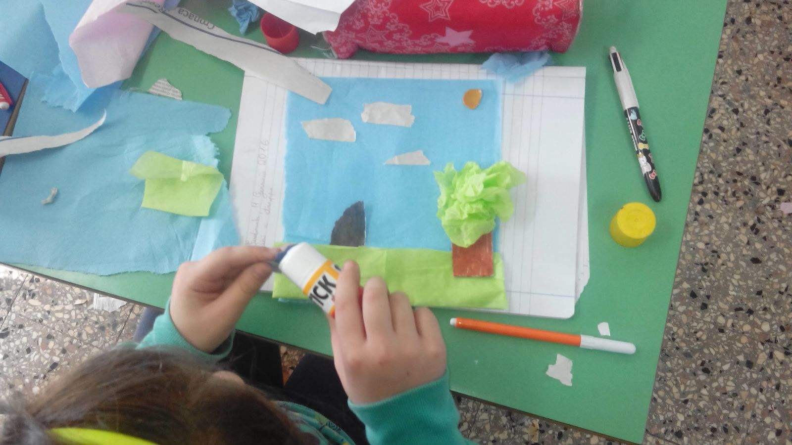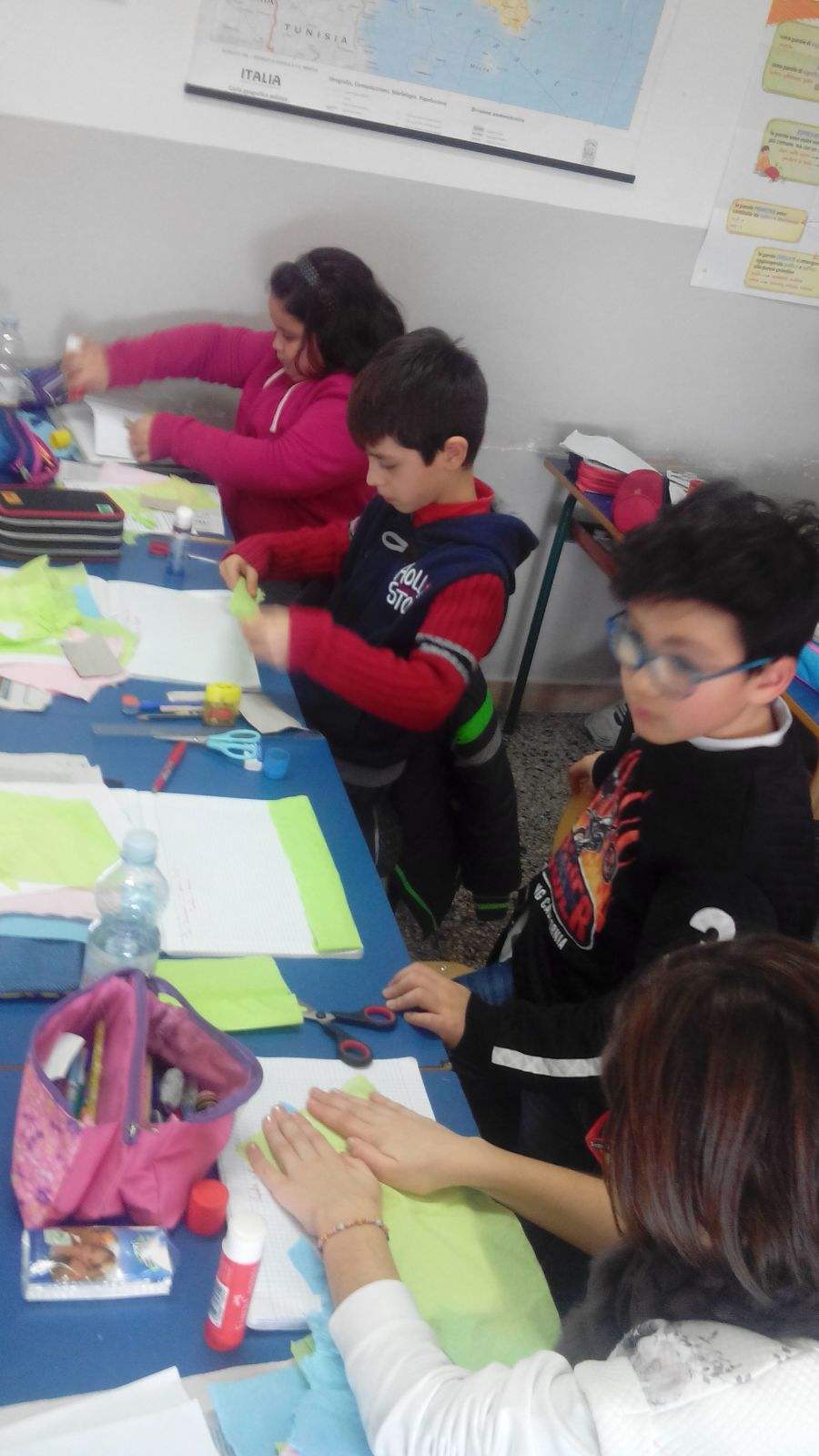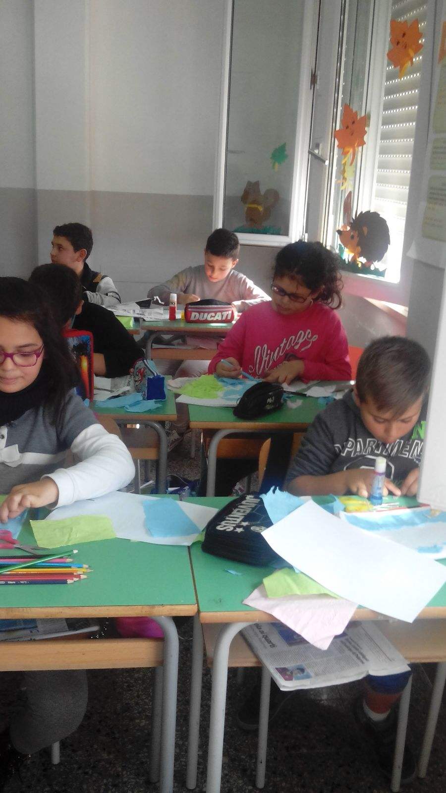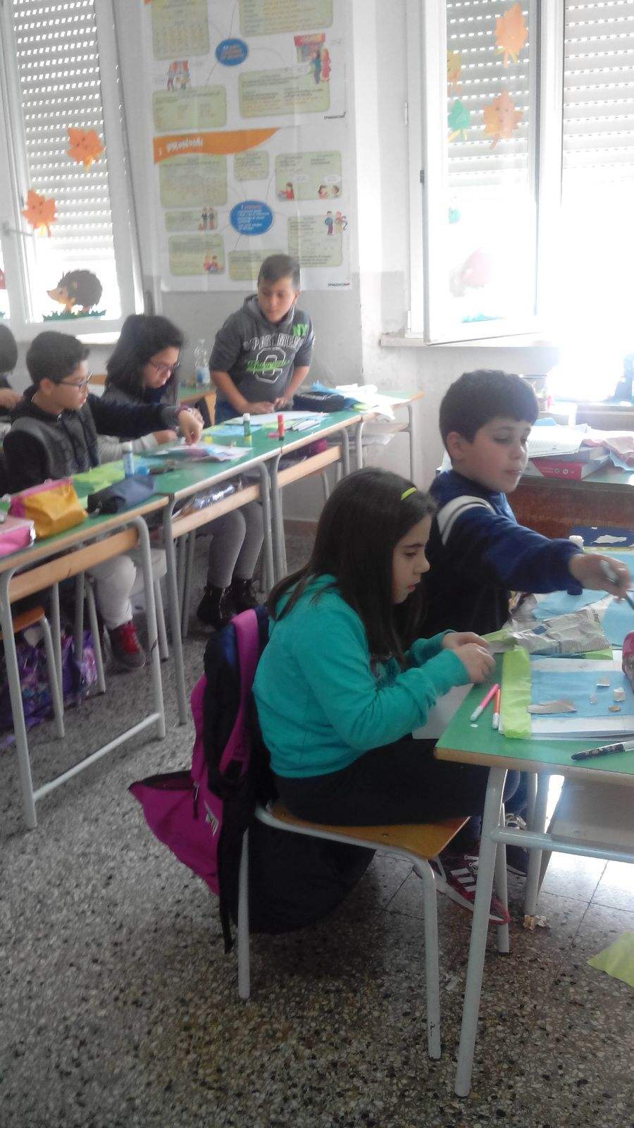 Gli alunni della 4^A, del Plesso "G.Carretta", nel laboratorio di arte e immagine, realizzano superfici a strappo per "movimentare" le linee precise del pittore Mondrian, utilizzando materiale di rIciclo: giornali, tovaglioli e cartoncini.