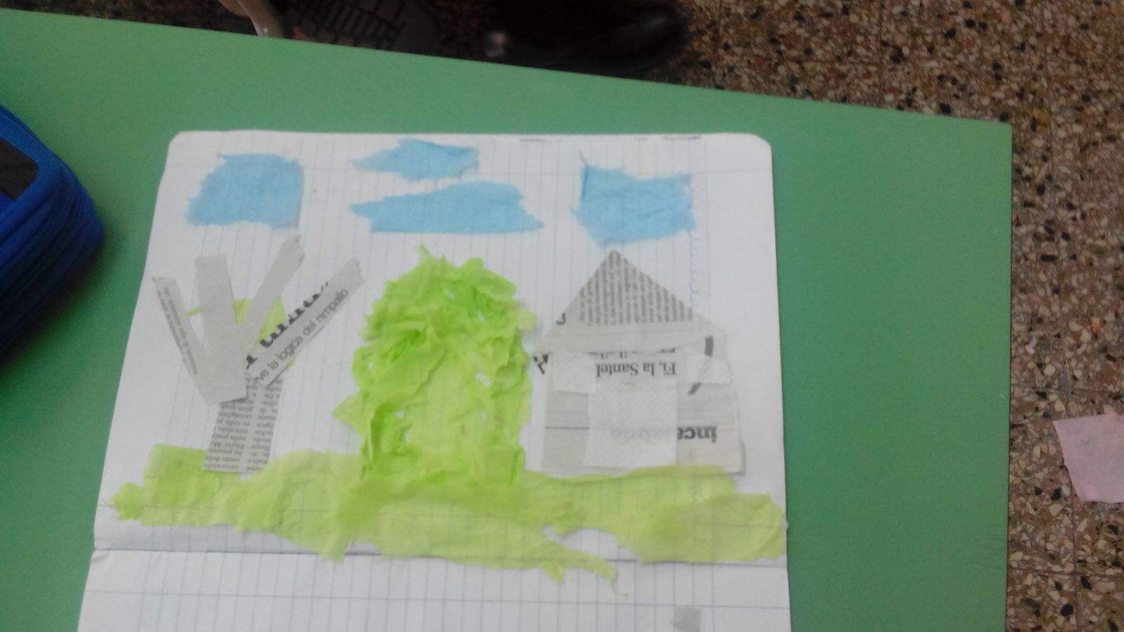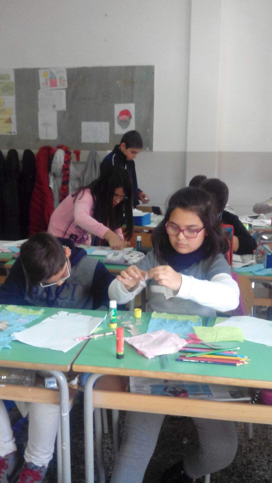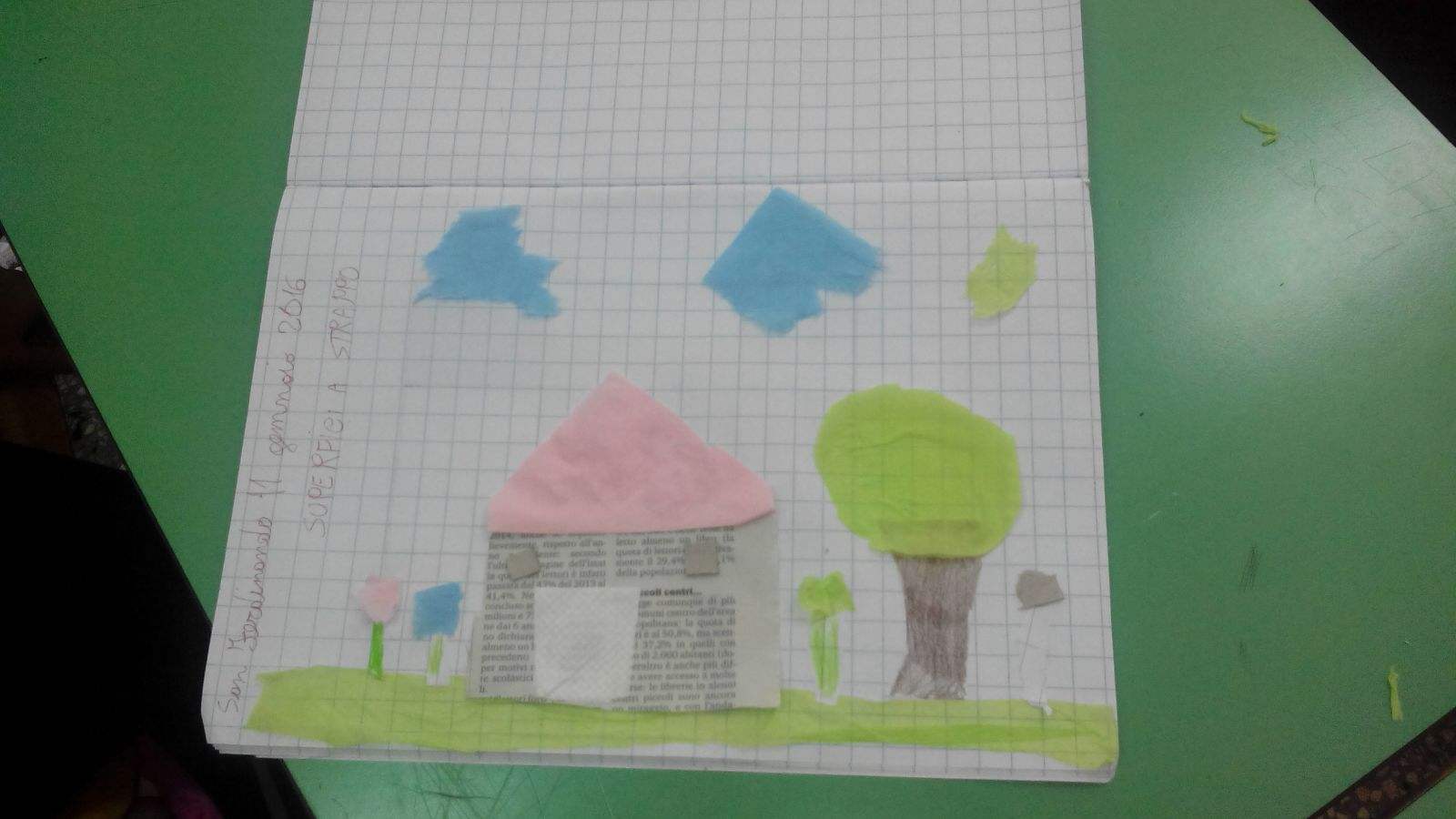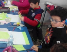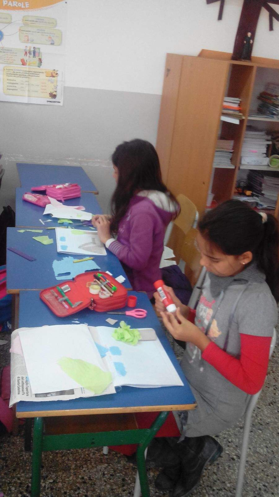 Gli alunni della 4^A, del Plesso "G.Carretta", nel laboratorio di arte e immagine, realizzano superfici a strappo per "movimentare" le linee precise del pittore Mondrian, utilizzando materiale di rIciclo: giornali, tovaglioli e cartoncini.