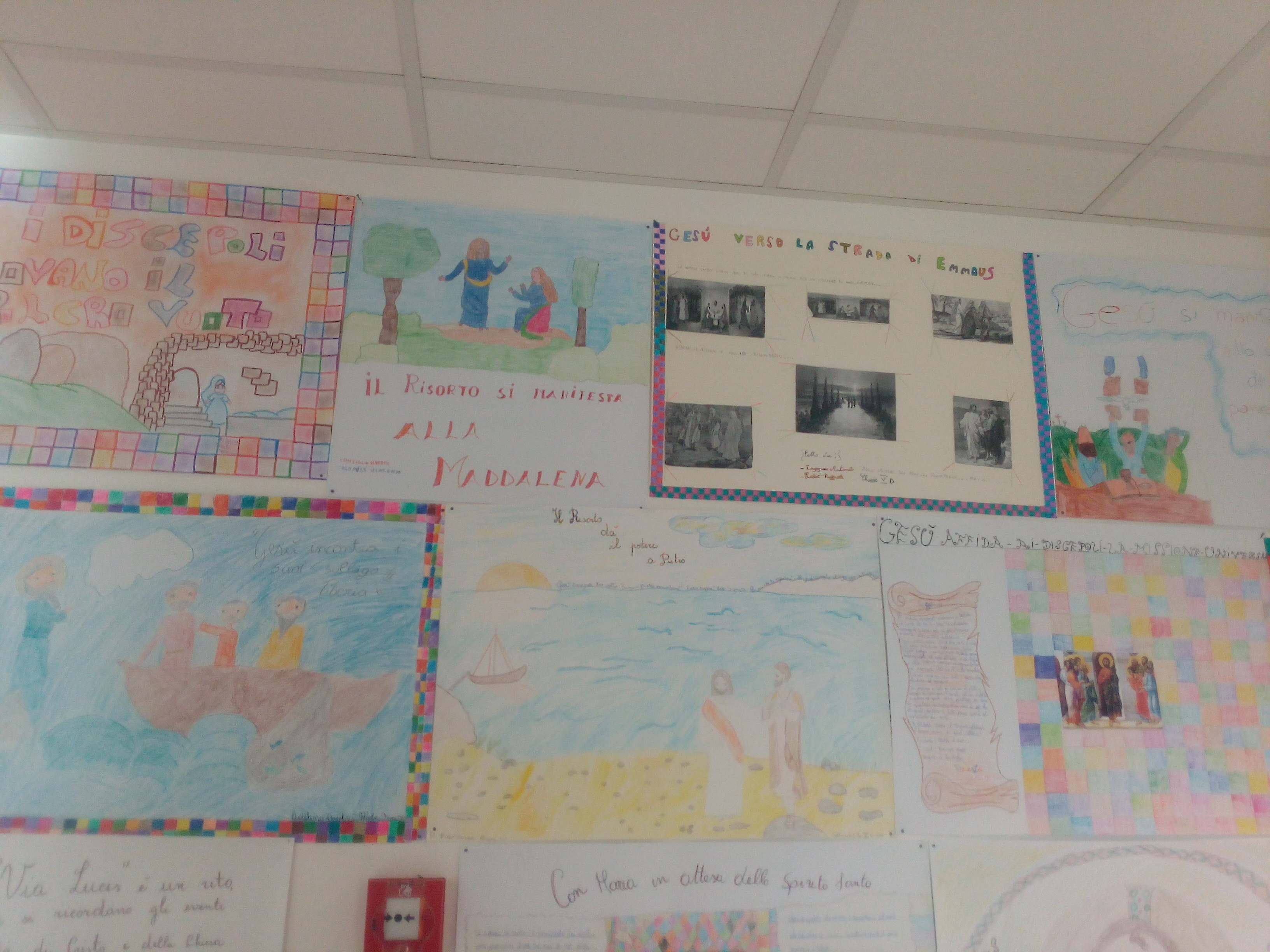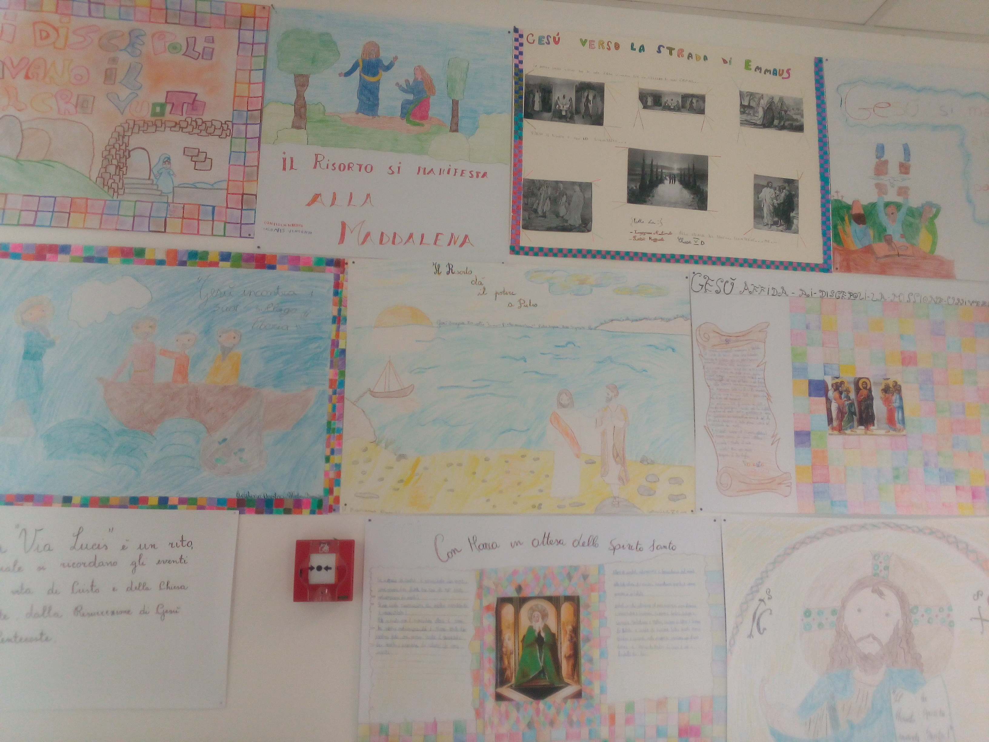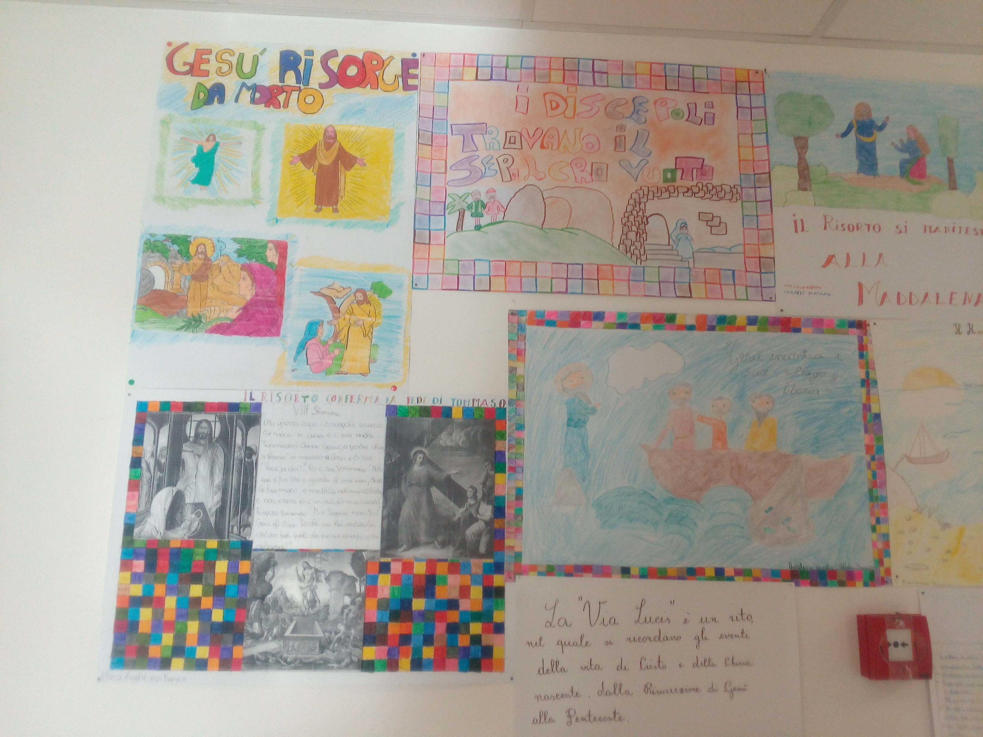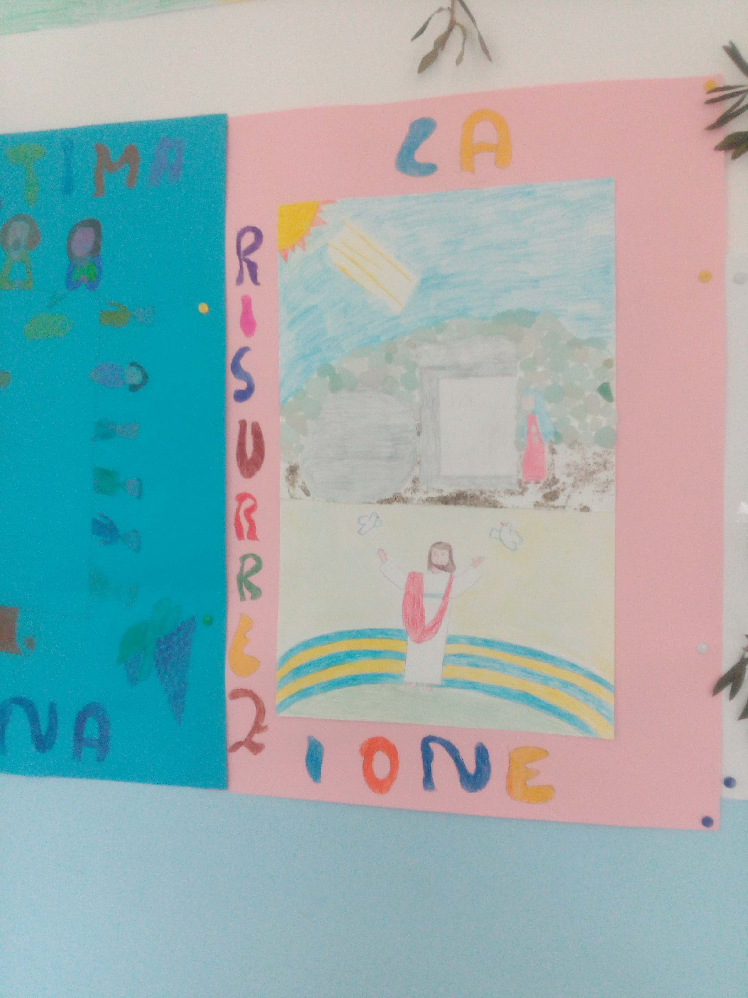 La classe 5 del plesso "Bosco" ha realizzato dei cartelloni riguardanti la Pasqua Cristiana con l'ins.De Vivo Lucia, utilizzando elementi naturali quali:cortecce di legno,bastoncini di legno,rametti d'ulivo,pietre colorate,foglie,che rispecchiano il loro territorio circondato dal verde e dalla natura.La risurrezione è posta al centro dei vari percorsi pasquali per l'importanza fondamentale che assume.