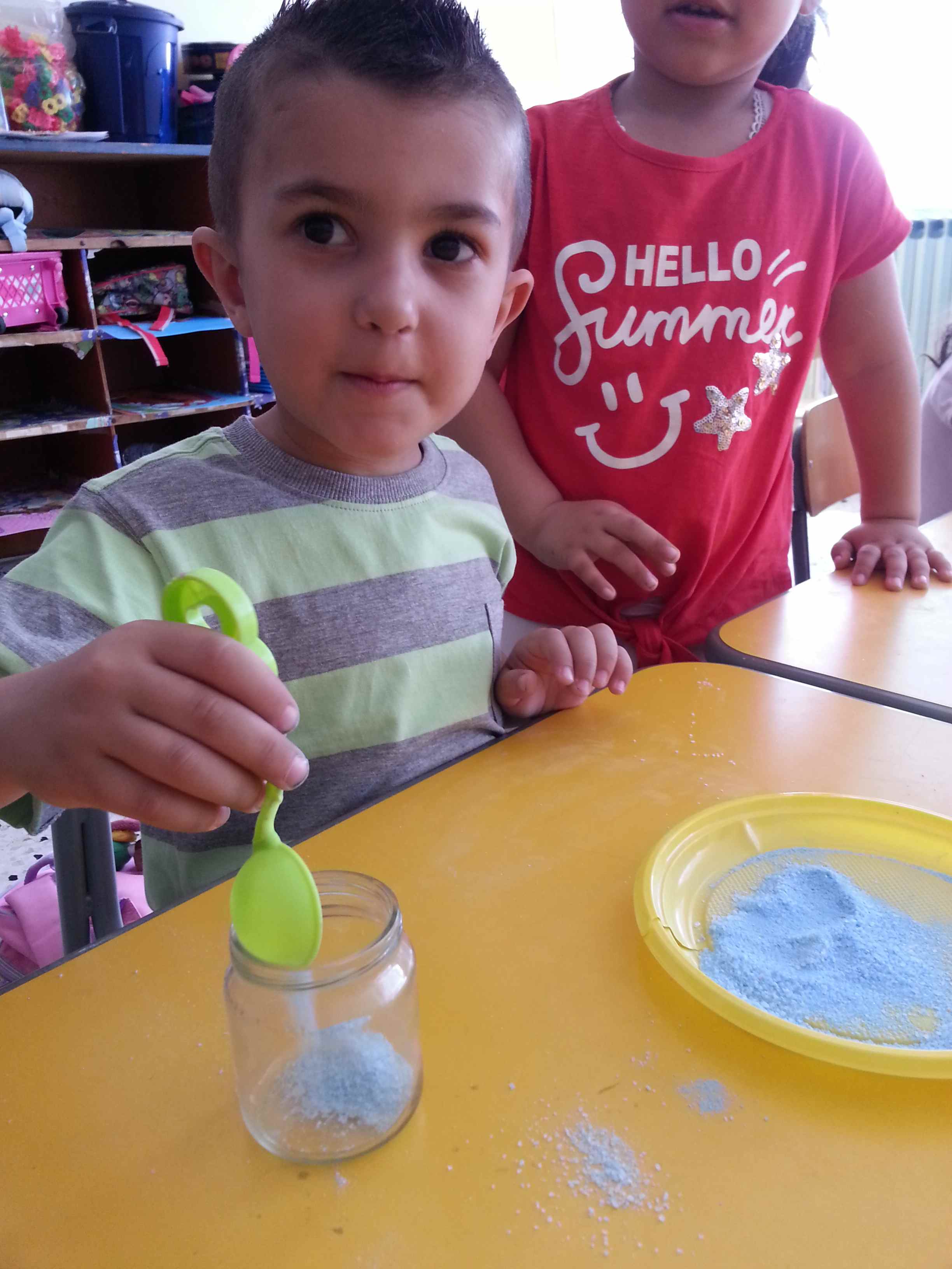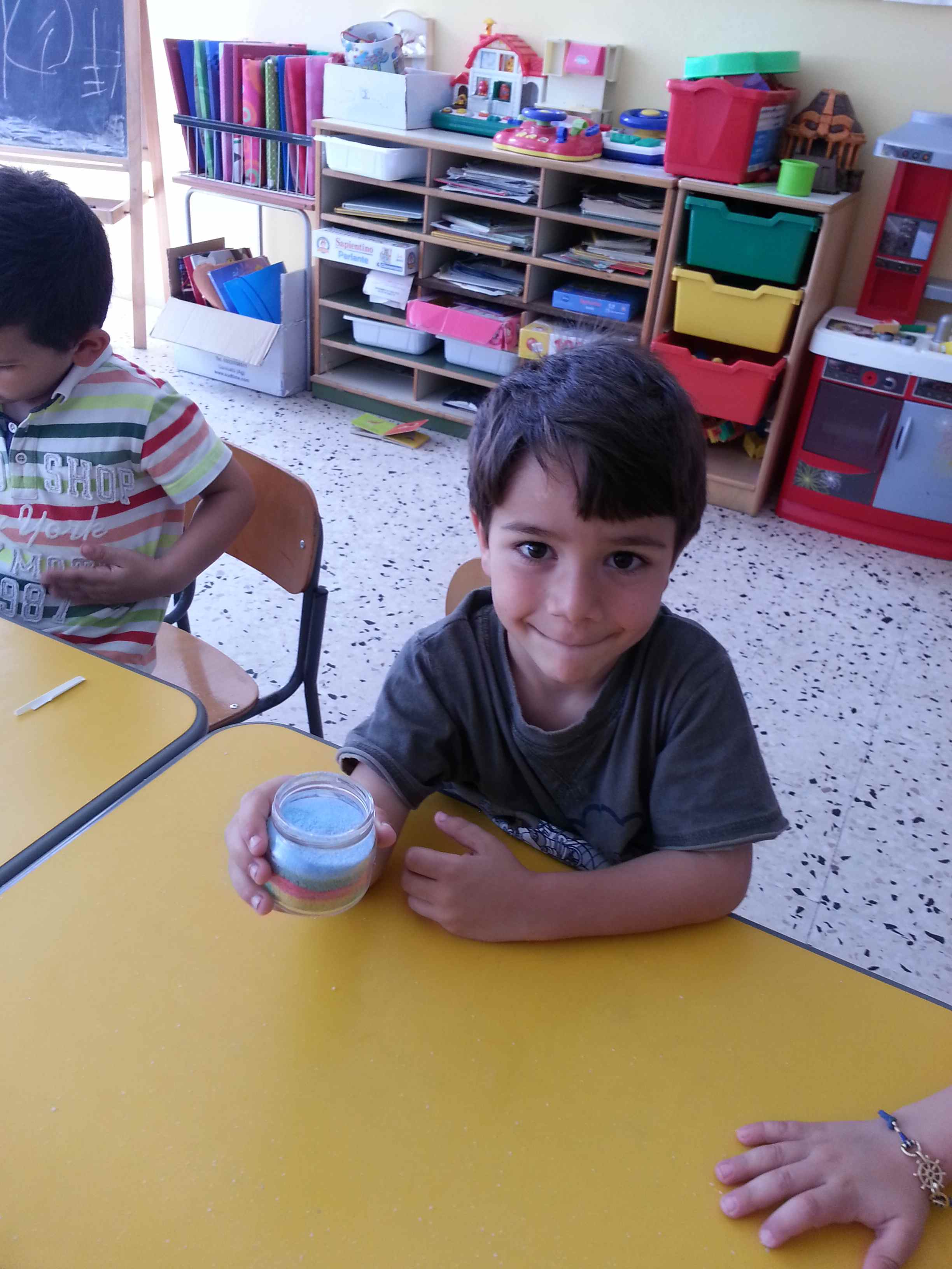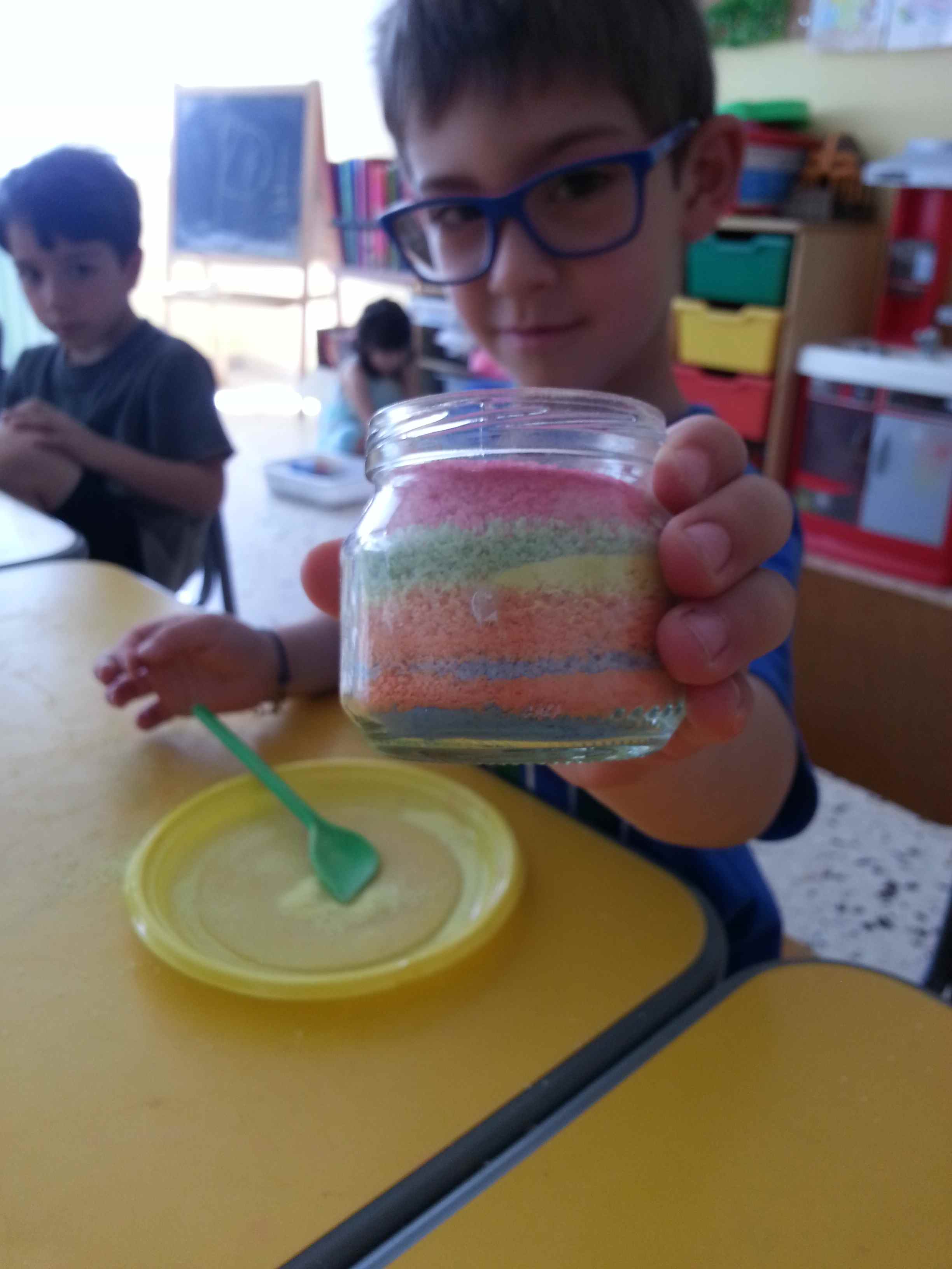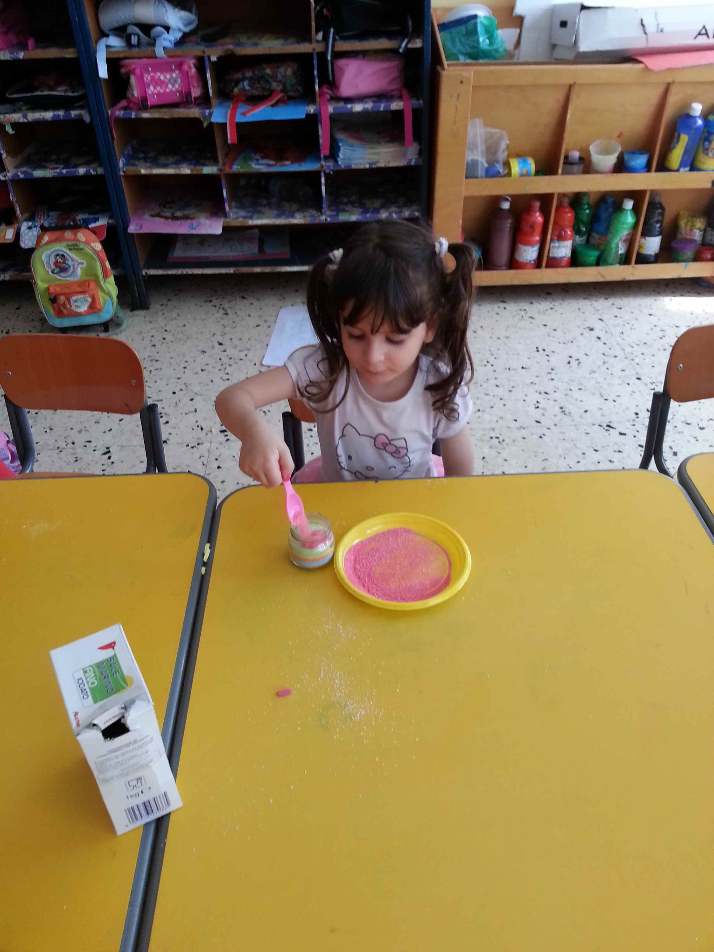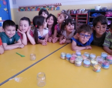 I bambini della II B si divertono a creare vasetti di sale colorato secondo una tecnica semplice e divertente