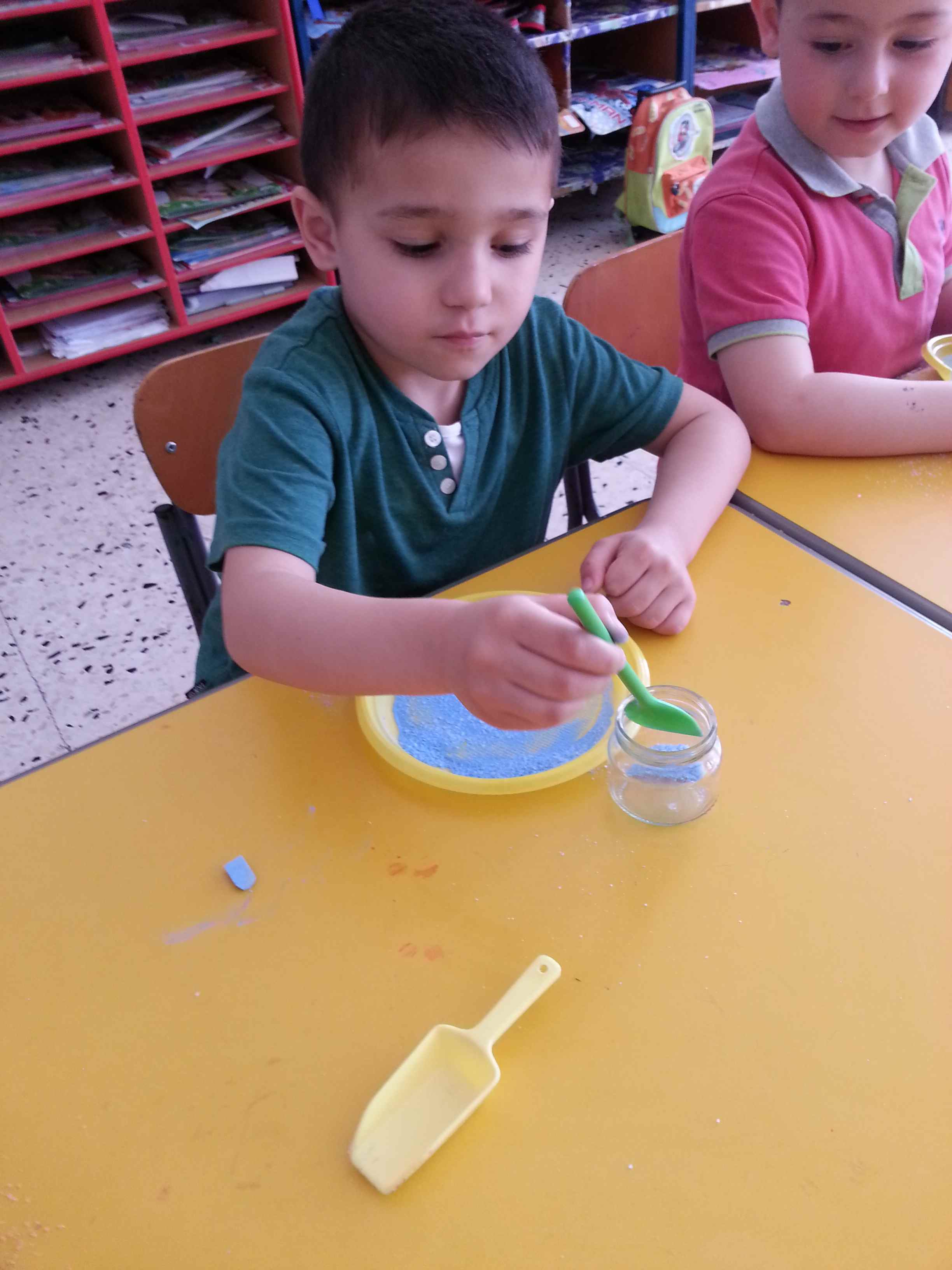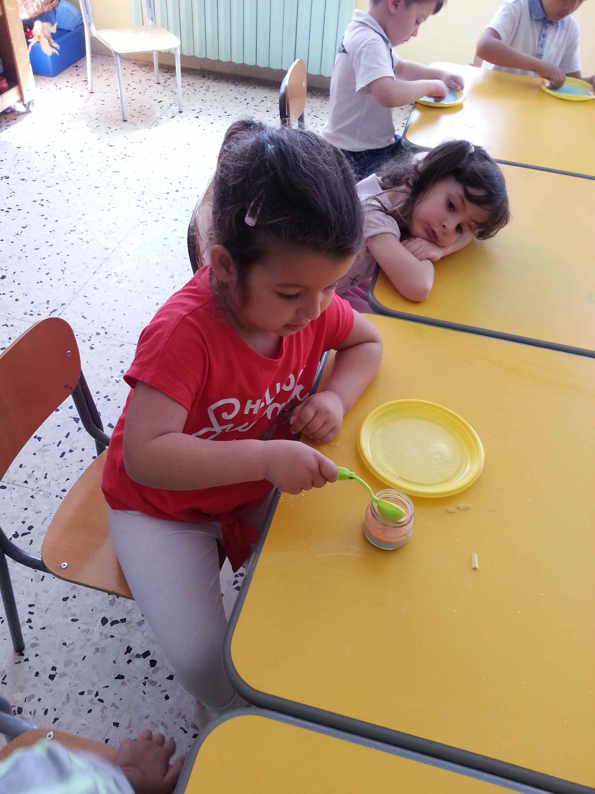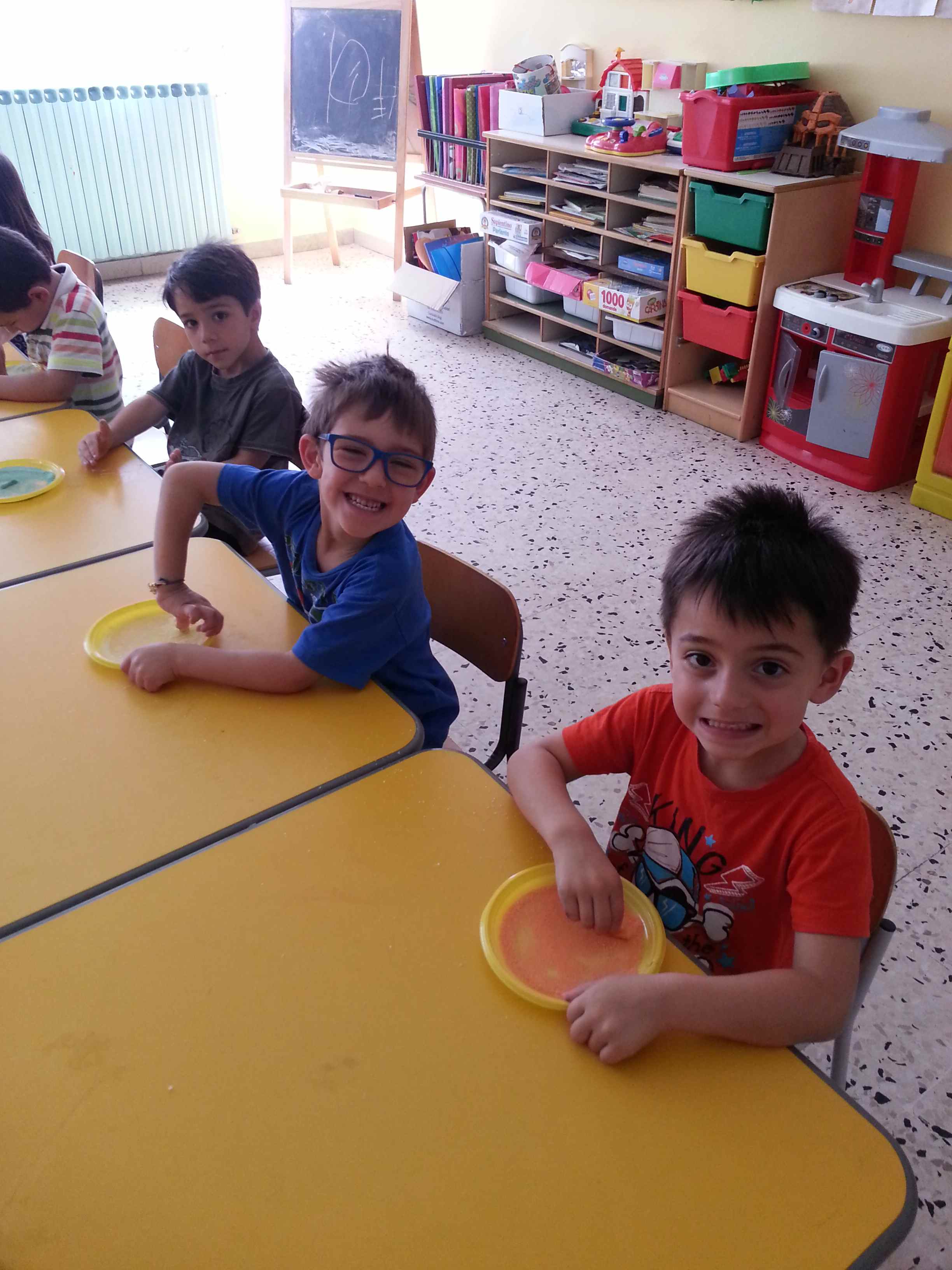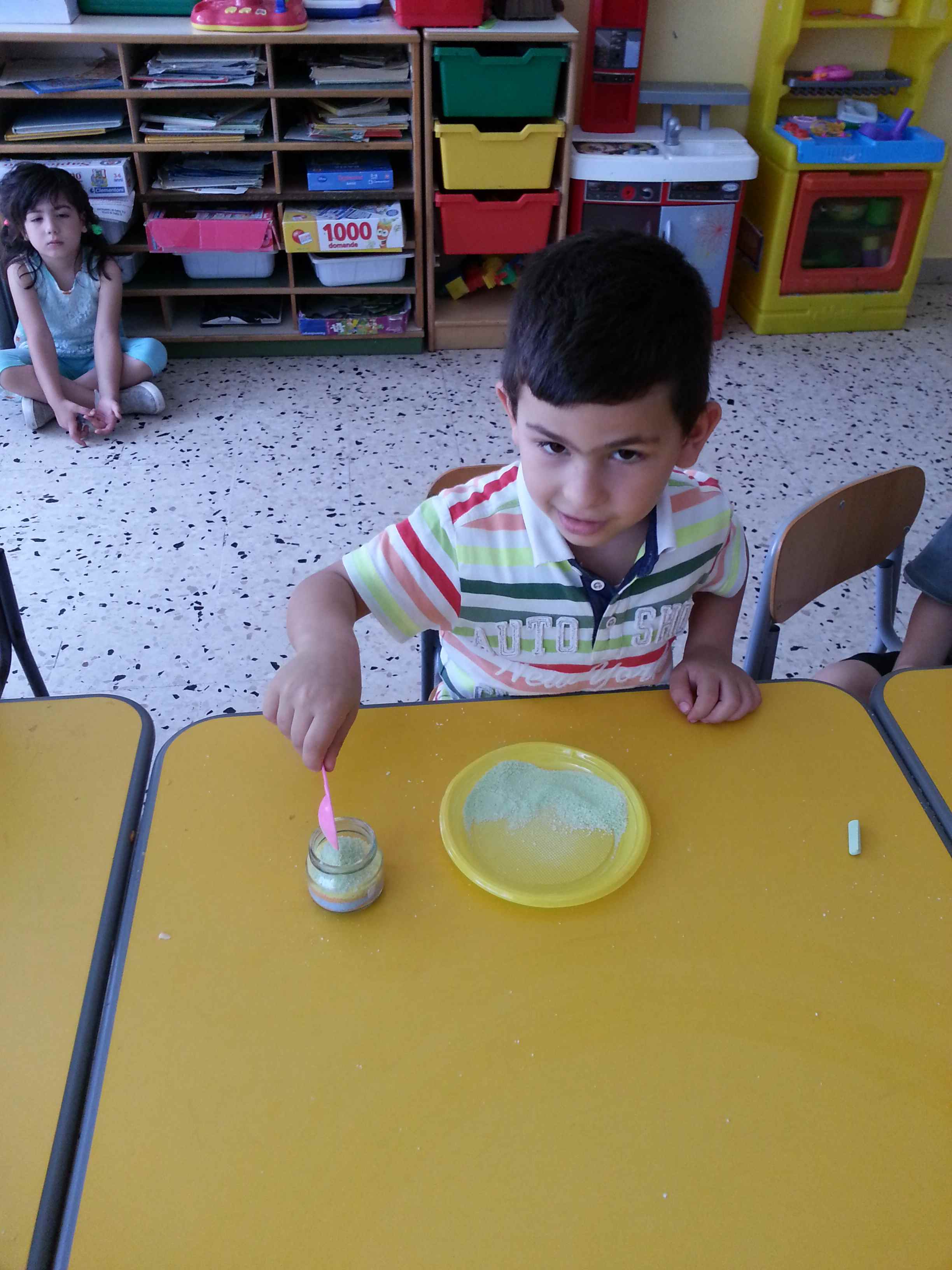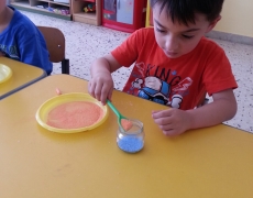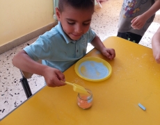 I bambini della II B si divertono a creare vasetti di sale colorato secondo una tecnica semplice e divertente