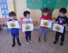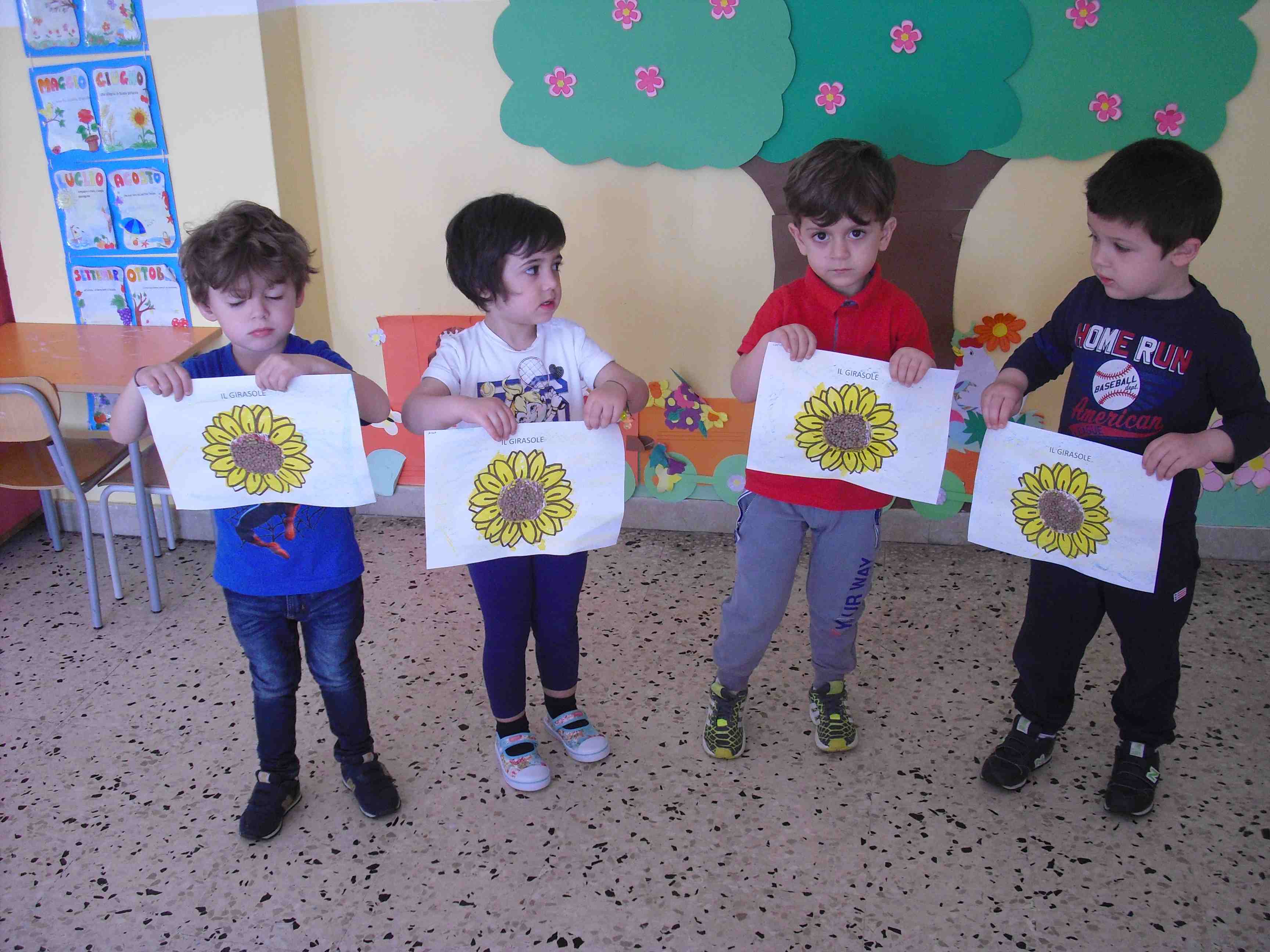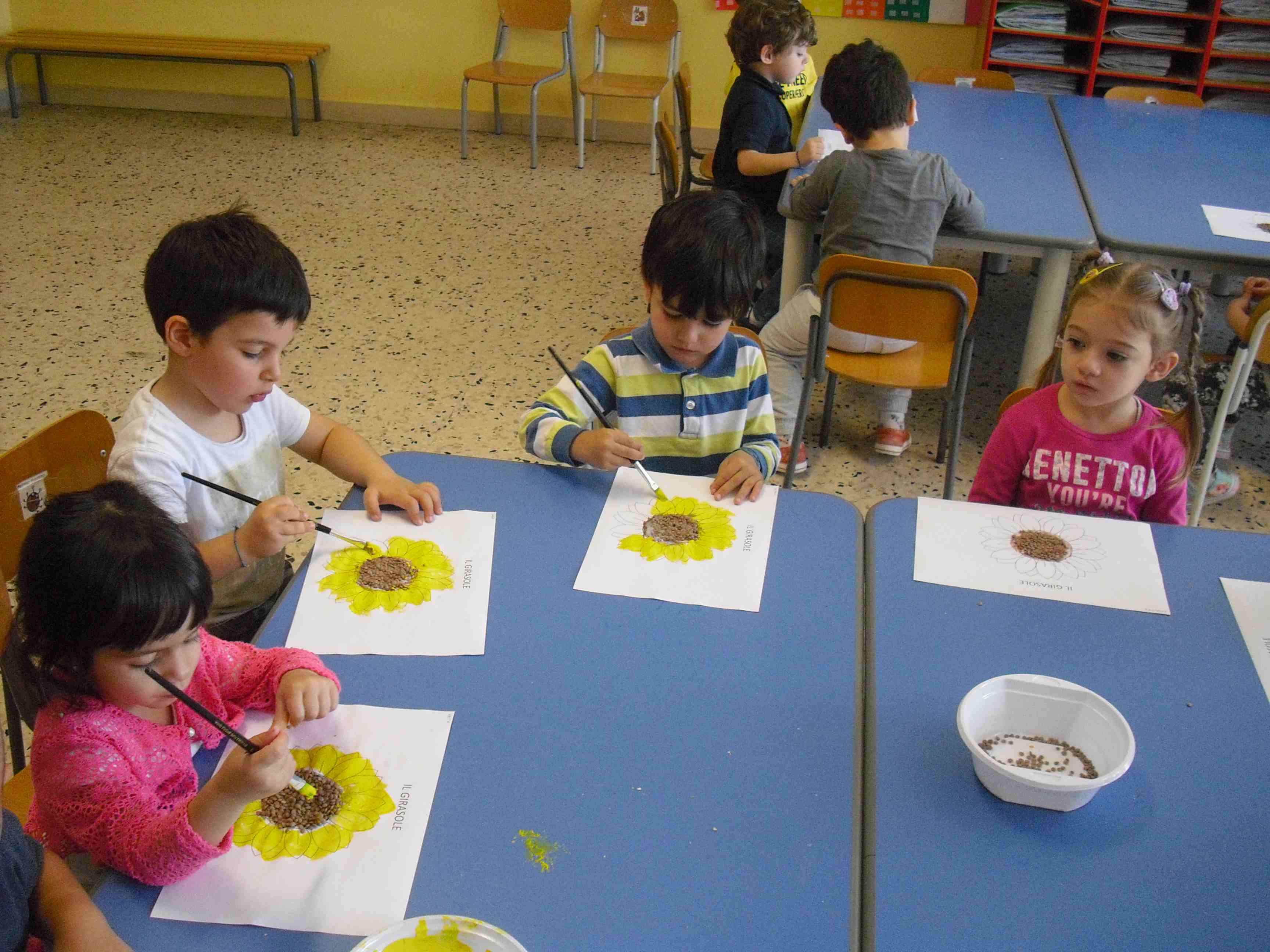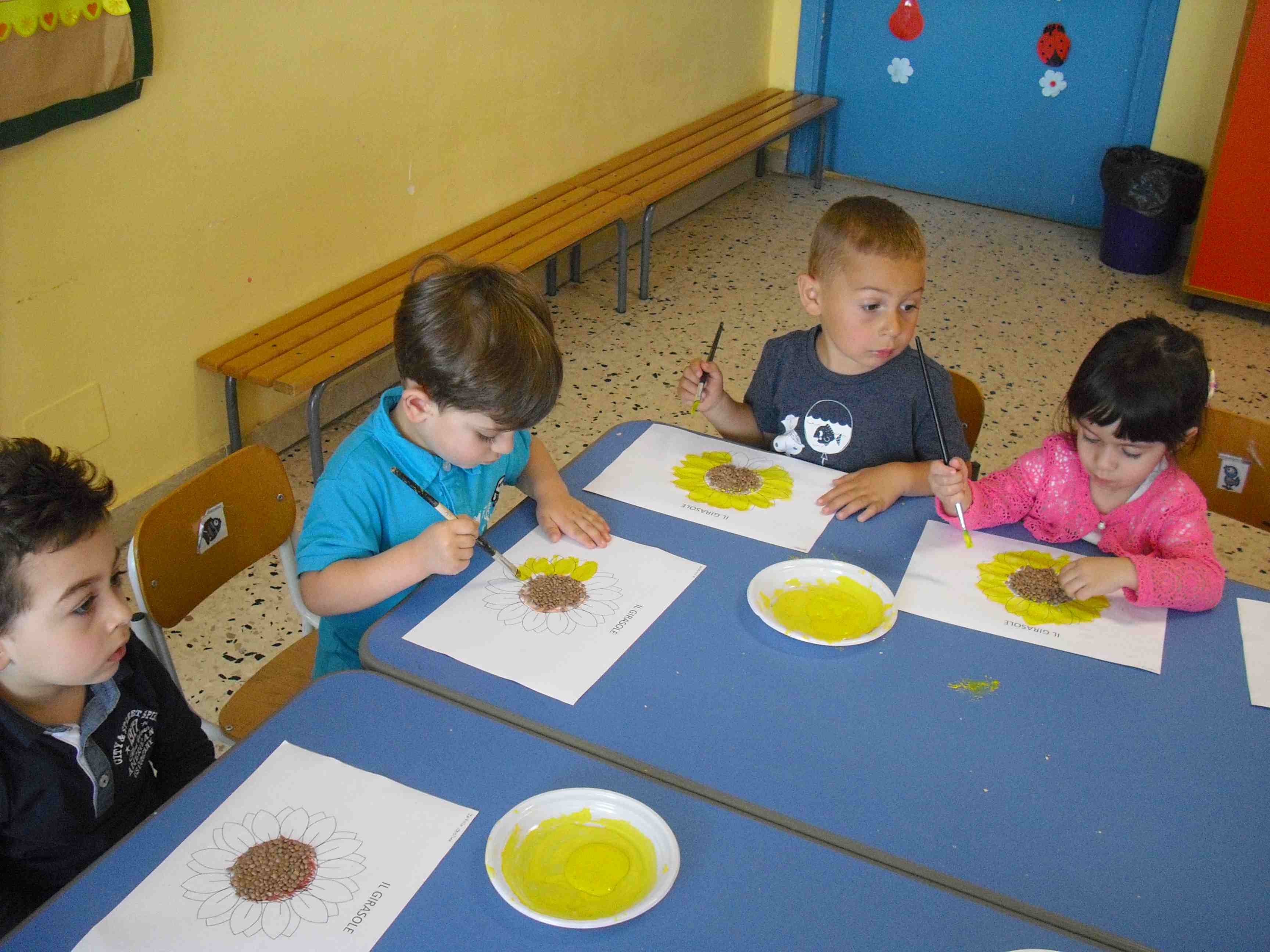 I bambini della sezione 1° B della scuola dell' Infanzia "Figliuzzi" dopo l'ascolto della storia del Girasole si sono divertiti a realizzare utilizzando i semi di lenticchia e della tempera gialla il loro girasole