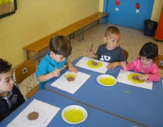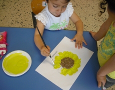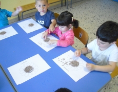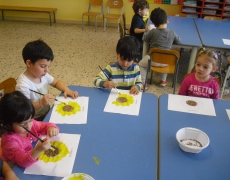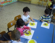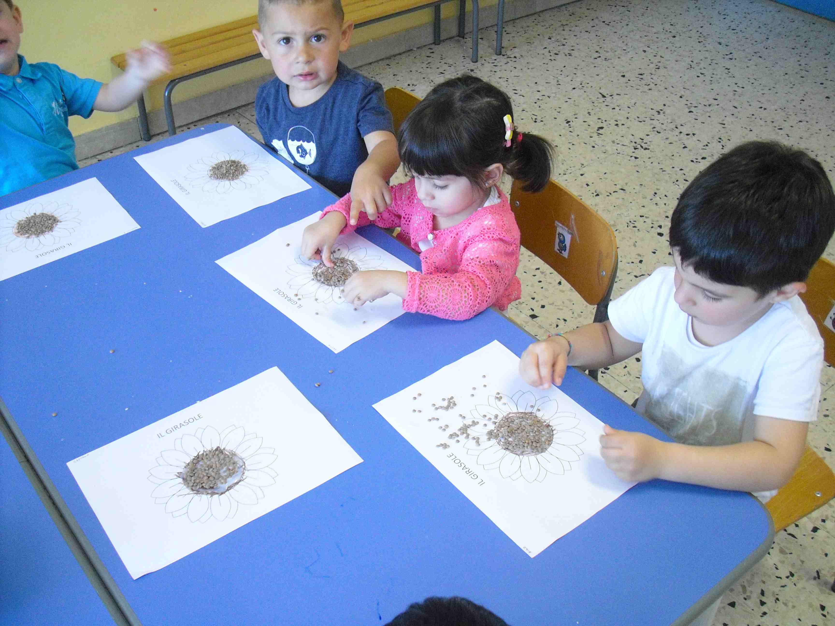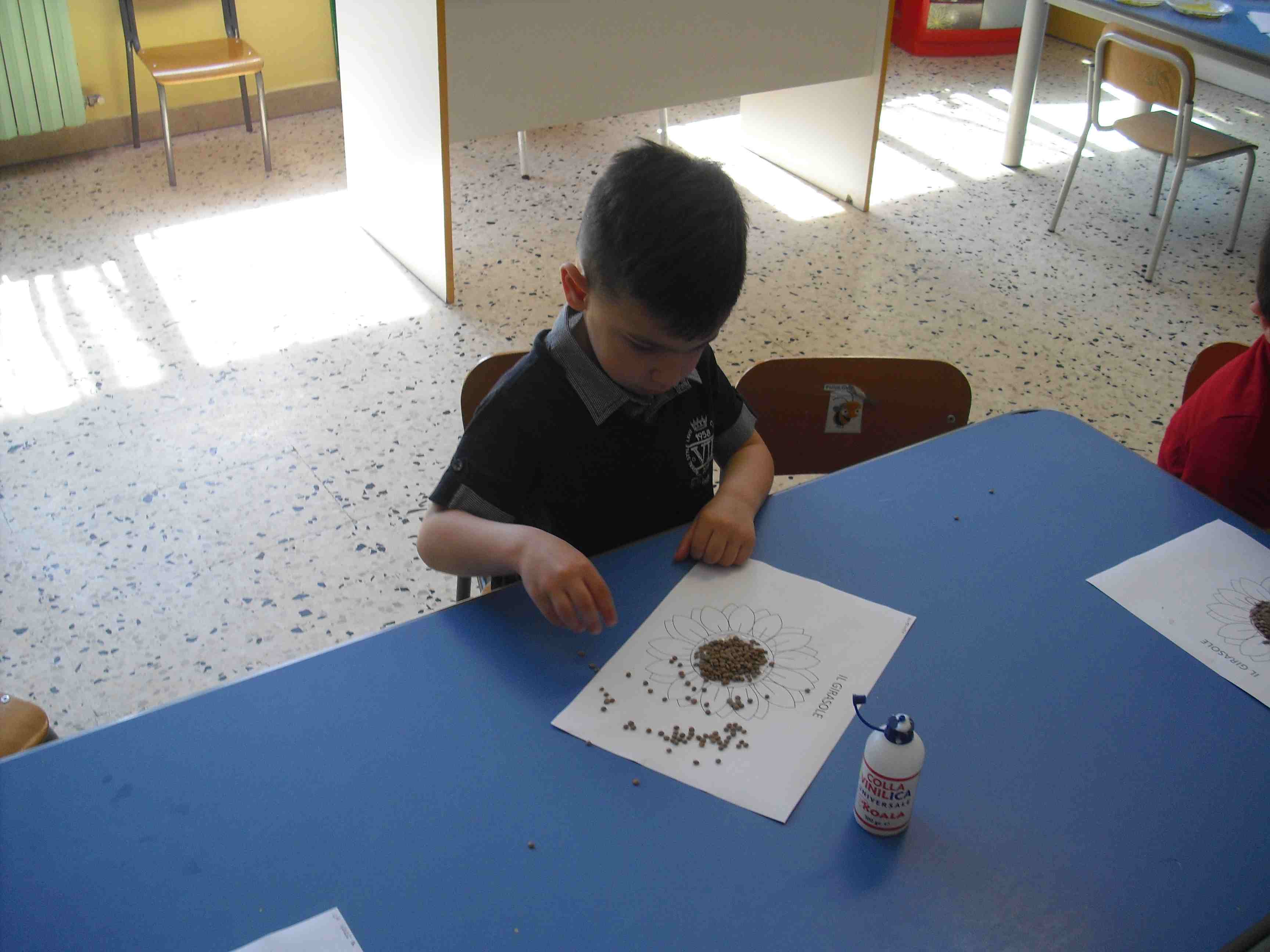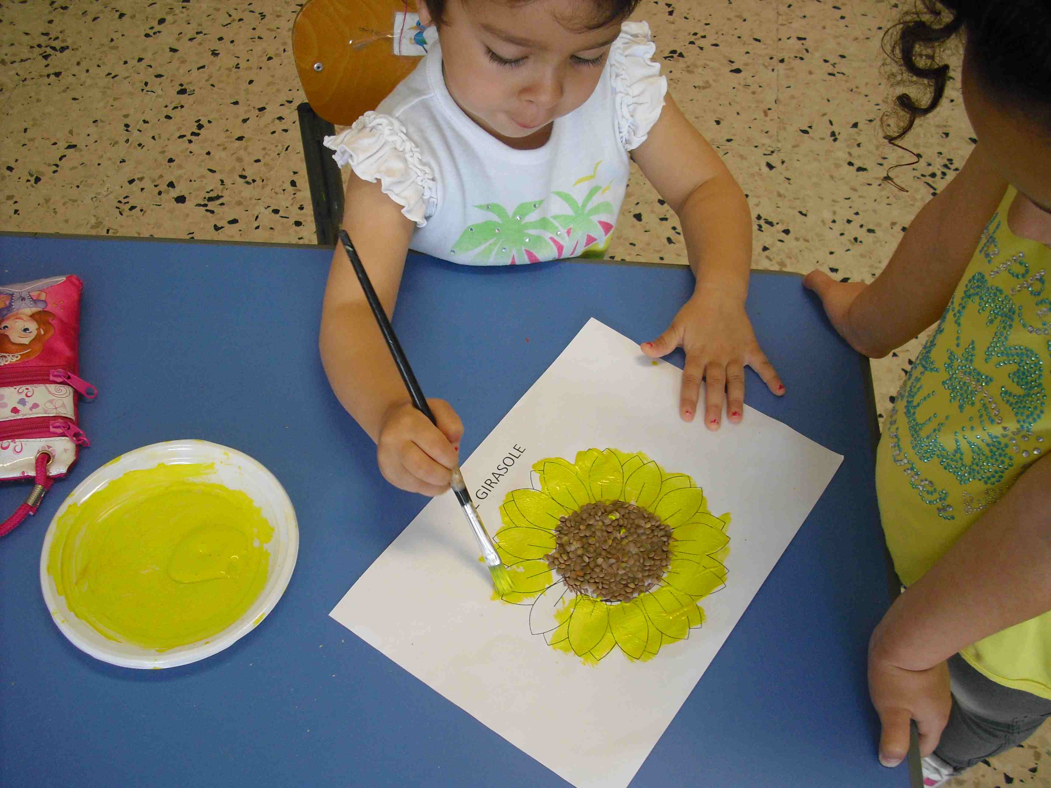 I bambini della sezione 1° B della scuola dell' Infanzia "Figliuzzi" dopo l'ascolto della storia del Girasole si sono divertiti a realizzare utilizzando i semi di lenticchia e della tempera gialla il loro girasole