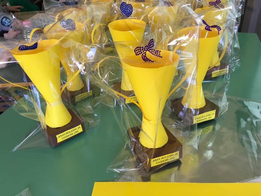 Ecco la Coppa realizzata dai bambini della quarta B,in occasione della festa del papà Abbiamo usato cartoncini in formato A 4 , ritagliato lungo dei tratteggi ,piegati nelle parti seghettate , e assemblate con colla a caldo. Il supporto porta coppa è rimasto aperto da un lato e lì i bambini vi hanno infilato i loro affettuosi pensieri. La coppa completa  è stata imbustata con carta  trasparente e fermata com un piccolo cuore.