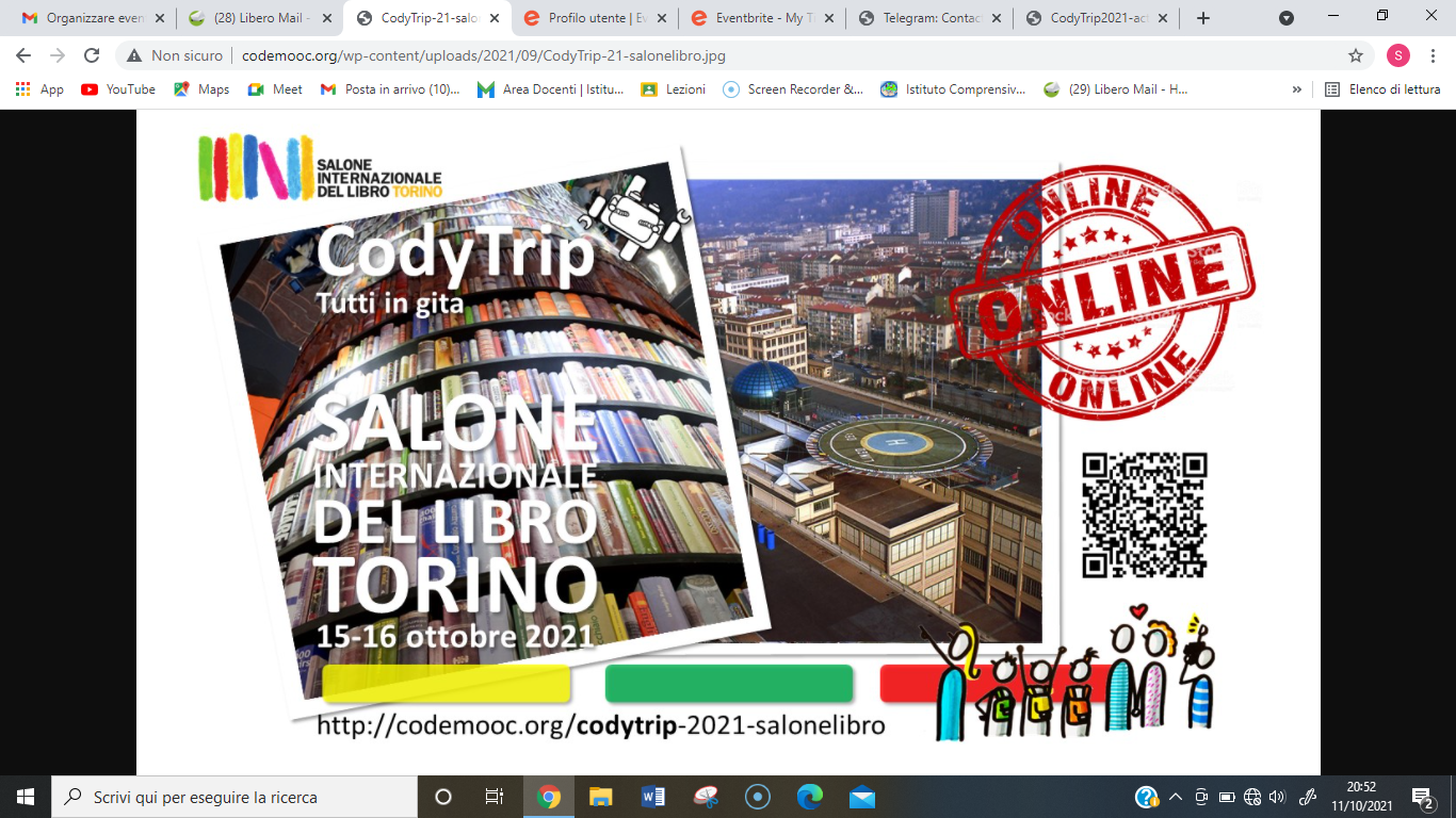 Gita online al Salone Internazionale del Libro di Torino del 15 e 16 ottobre 2021 per comprenderne lo spirito e l’intento e per vedere come sia possibile usare in modo originale e semplicissimo le tecnologie digitali, il coding e l’immaginazione per colmare le distanze e condividere con migliaia di coetanei l’esperienza di una gita scolastica.Visita da dietro le quinte per capire come funziona la macchina organizzativa, incontro con autori, editori e librai, visita gli stand, sale conferenza, sala stampa, letture, giochi e laboratori pratici. In virtù dell’impatto che CodyTrip ha dimostrato di poter avere in termini di contrasto alla povertà educativa, di educazione civica digitale e di dialogo intergenerazionale, l’iniziativa gode del patrocinio di Save the Children, Fondazione Mondo Digitale, Grey Panthers e Telefono Azzurro.