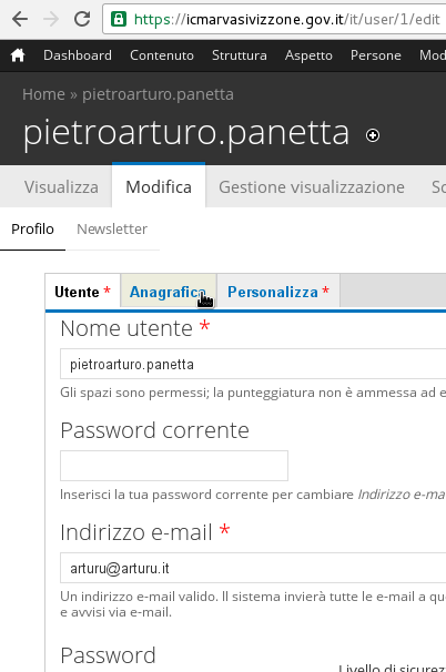 Andando a cliccare sulle varie schede del profilo (sono i pulsanti denominati: "Utente", "Anagrafica" e "Personalizza") verranno visualizzati diversi campi e seguendo le istruzioni a corredo ad ognuno di essi è possibile personalizzare il proprio profilo.