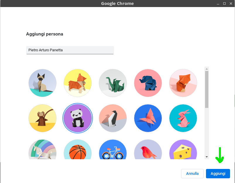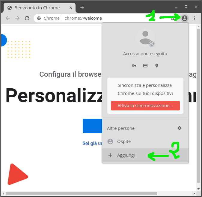 Segui le istruzioni del paragrafo "Aggiungere una persona o un profilo" presente in questa guida https://support.google.com/chrome/answer/2364824?co=GENIE.Platform%3DDesktop&hl=it , nella galleria fotografica in allegato (si trova alla fine del testo, sotto) trovi delle immagini che ti facilitano in questa operazione.