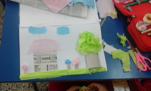 Gli alunni della 4^A, del Plesso "G.Carretta", nel laboratorio di arte e immagine, realizzano superfici a strappo per "movimentare" le linee precise del pittore Mondrian, utilizzando materiale di rIciclo: giornali, tovaglioli e cartoncini.