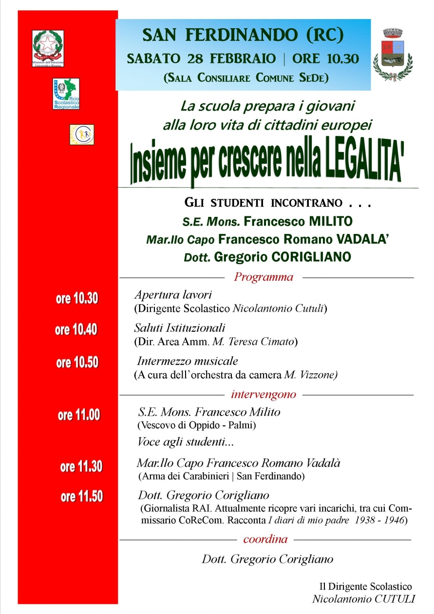 A San Ferdinando gli studenti incontrano S.E. Mons. Francesco Milito, il Marr.llo Capo Francesco Romano Vadalà, il Dott.Gregorio Corigliano.