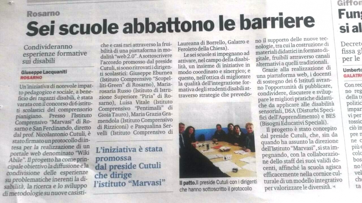 l’Istituto Comprensivo “Scopelliti-Green” di Rosarno,l’Istituto d’Istruzione Superiore “R. Piria” di Rosarno, l’Istituto Comprensivo 1 "F. Pentimalli" di Gioia Tauro, l’Istituto Comprensivo di Rizziconi, l’Istituto Comprensivo di Laureana Galatro Feroleto, rappresentati rispettivamente dai Dirigenti Scolastici Giuseppe EBURNEA, Maria Rosaria RUSSO, Luisa VITALE, Maria Grazia GRAMENDOLA e Pasqualina SERVELLI hanno siglato con la nostra Scuola un protocollo di intesa per la realizzazione di un portale web denominato “WIKI ABILE”. Il progetto ha come obiettivo la diffusione e la condivisione delle esperienze su problematiche inerenti la disabilità, la ricerca e lo sviluppo di metodologie su nuove casistiche e casi rari attraverso la fruibilità di una piattaforma in modalità "web 2.0”.