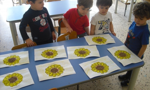 I bambini della sezione 1° B della scuola dell' Infanzia "Figliuzzi" dopo l'ascolto della storia del Girasole si sono divertiti a realizzare utilizzando i semi di lenticchia e della tempera gialla il loro girasole